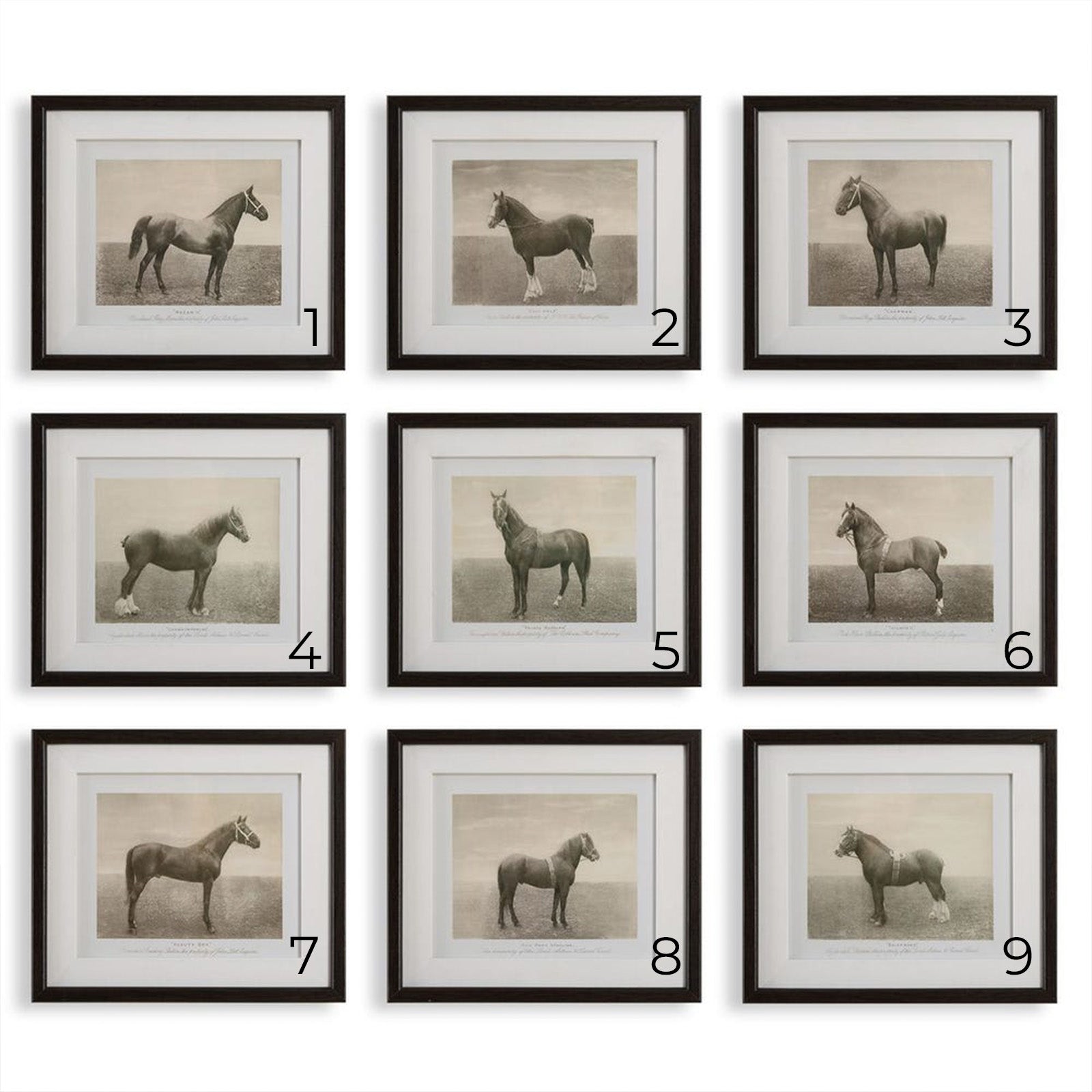 This regal set showcases nine antiqued sketches of horses belonging to dignitaries and elite members of society.