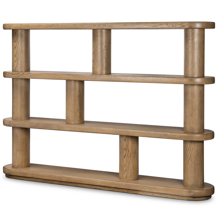 A playful space for books, keepsakes and more. Designed with a contrasting mix of cylindrical pillars and dramatically curved shelves on a plinth base, this wide bookcase is crafted from thick oak veneer.