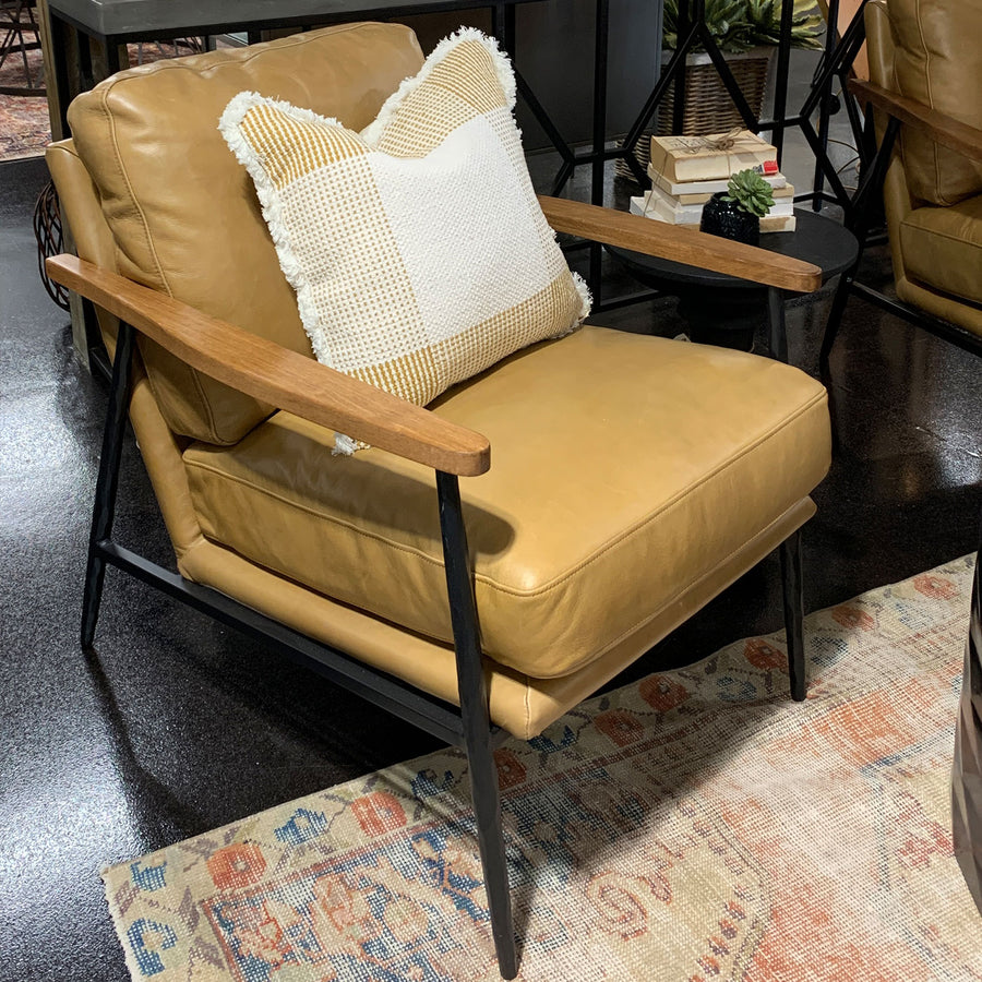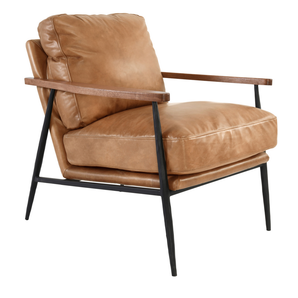 Sit down and relax in the buttery tan Christopher club chairs. Supported with a black iron frame and warm natural rubberwood armrests!