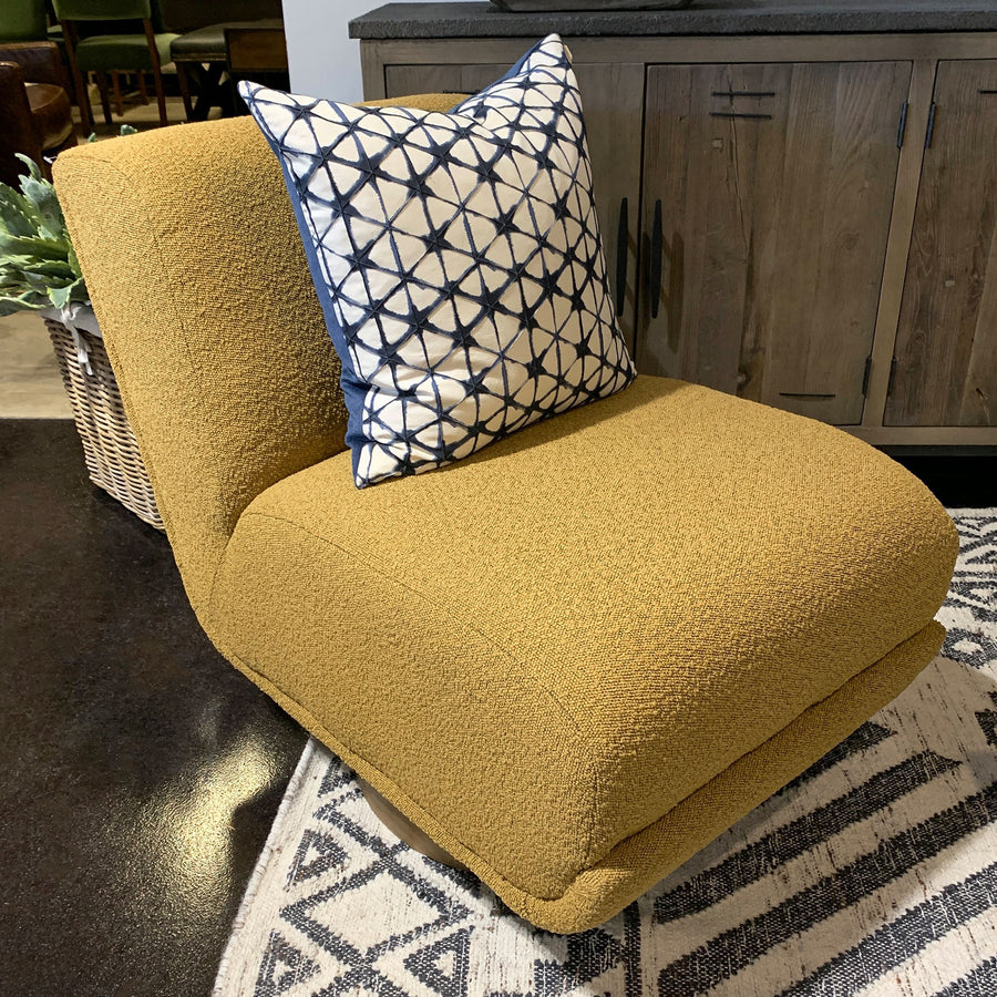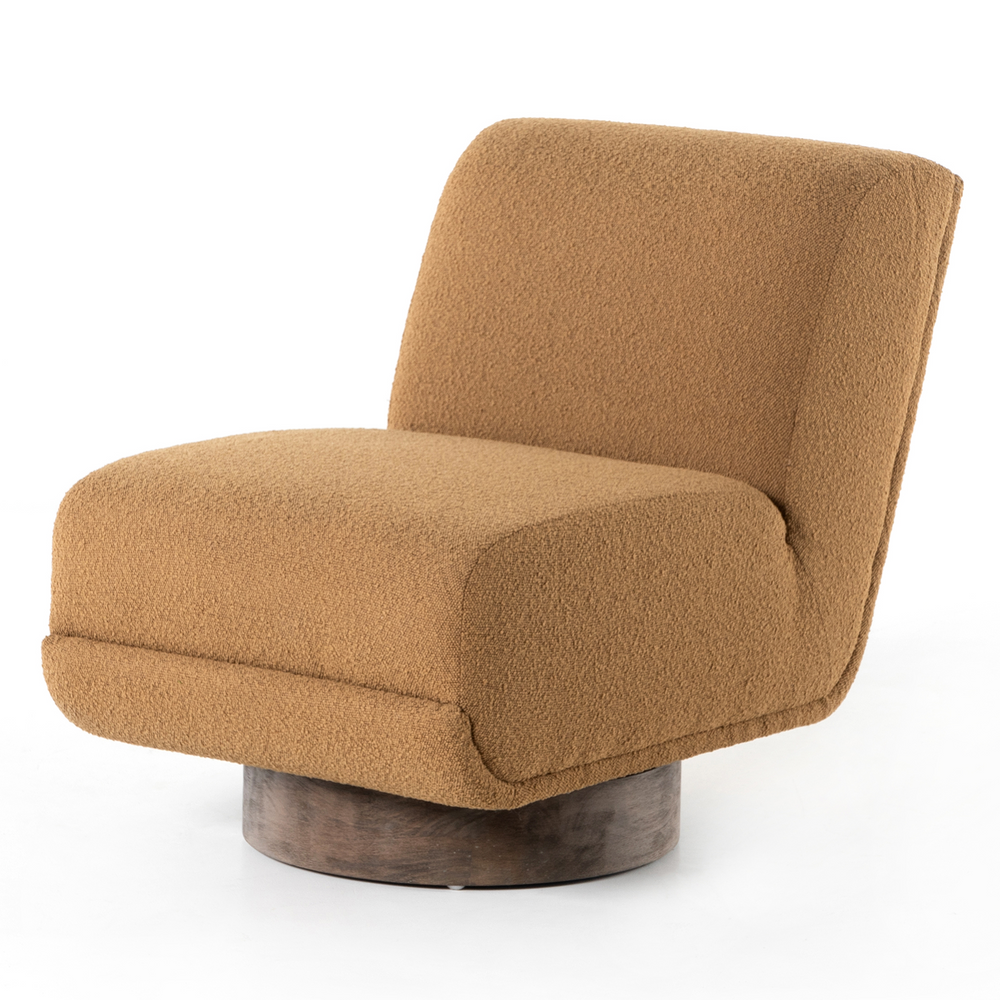 A stylish play on function. With chunky, amber-colored upholstery, armless accent seating tops a rounded parawood swivel base, wire-brushed for subtle vibes. Option to pair with matching side table, which can be fastened to or removed from either side with ease.