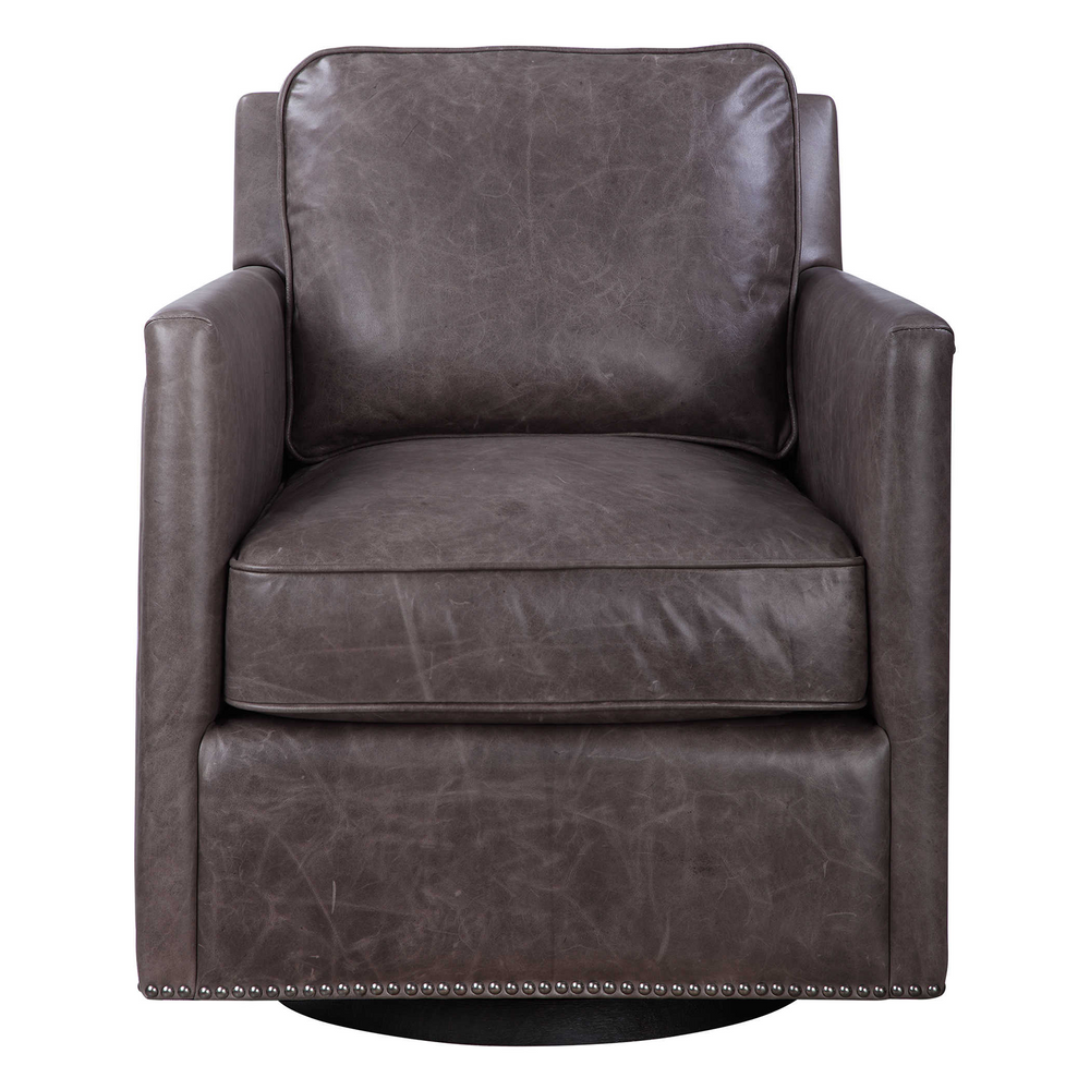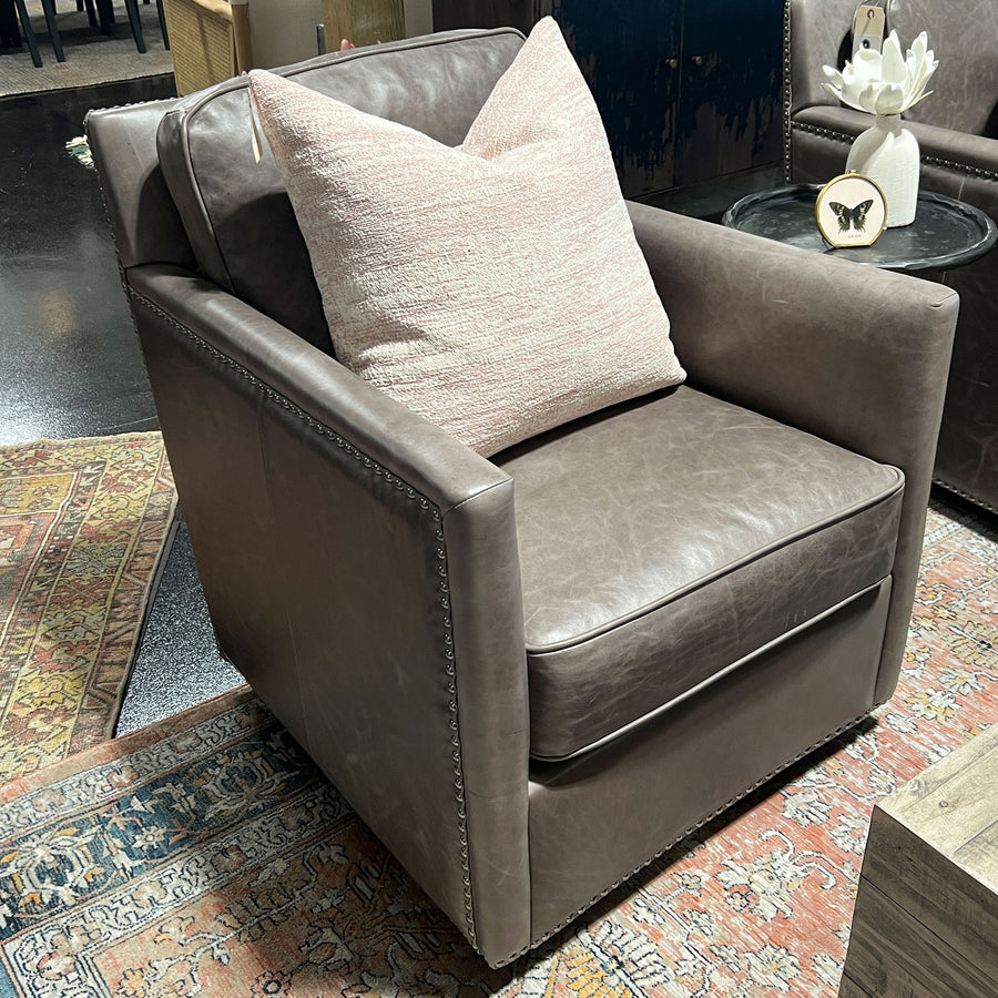 Classic Parisian club chair, with comfortable box cushions and birch frame, featuring character distressed, full grain leather in smoke gray with taupe brown undertones, accented by antique nickel nail head trim atop a swivel base. Because leather is a natural product, both texture and color will vary slightly, enhancing leather's uniqueness.