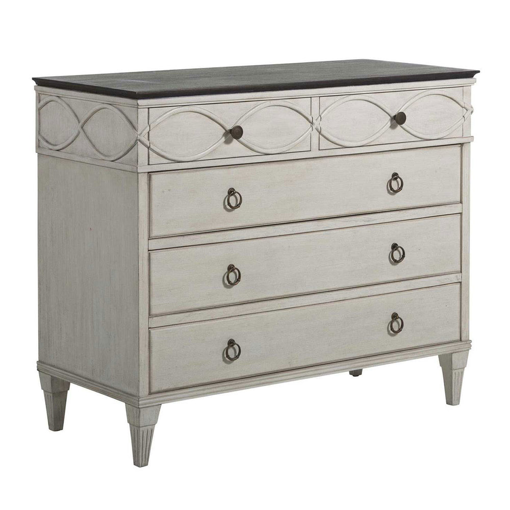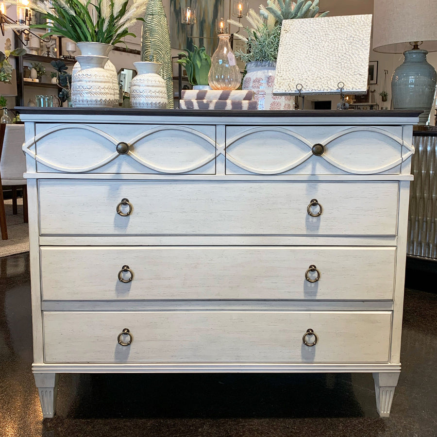 Gentle swooping curves wrap around the top of the Ivy chest. Finished in a soft sesame white with a contrasting brushed ebony top. Five drawers with antique bronze pulls provide concealed storage space.
