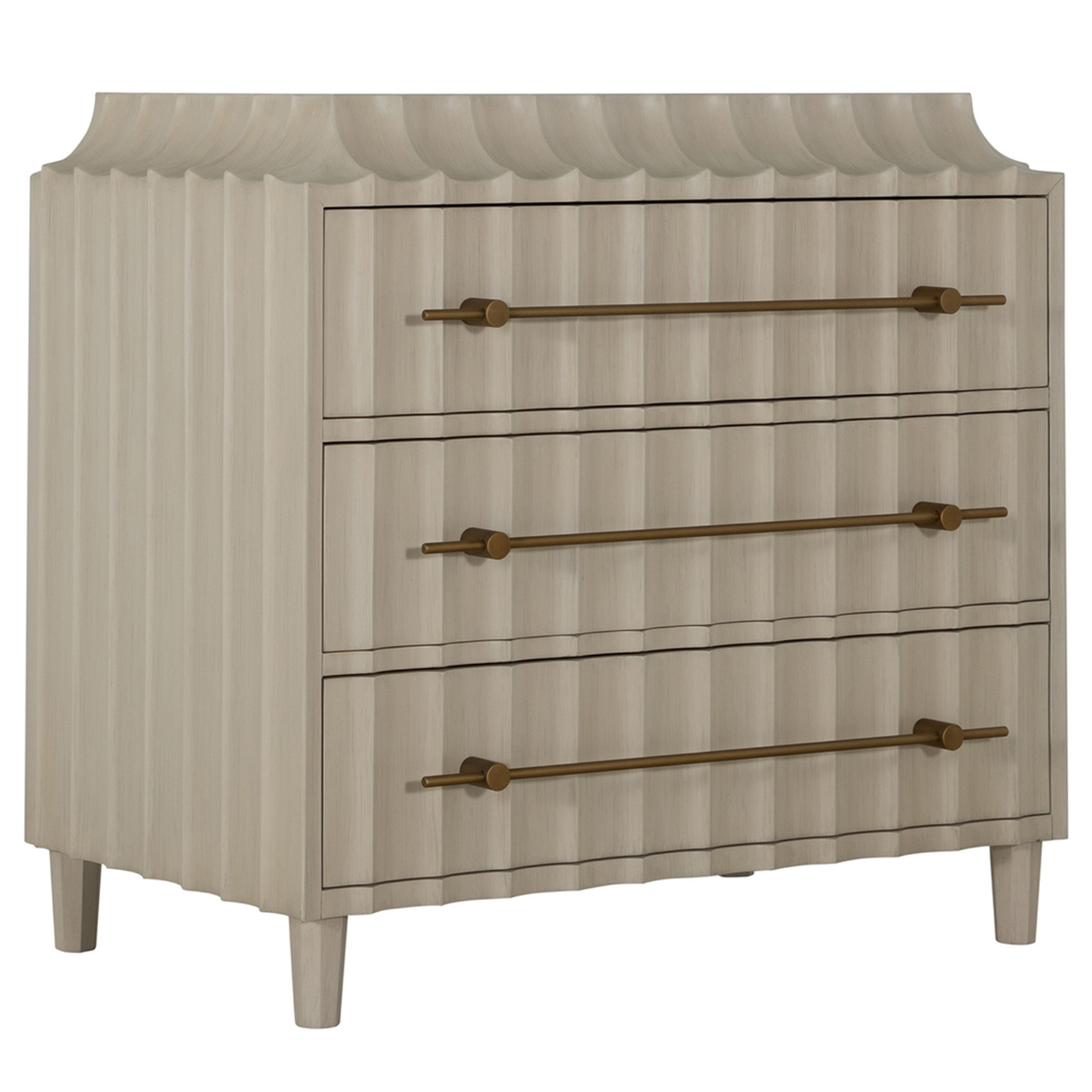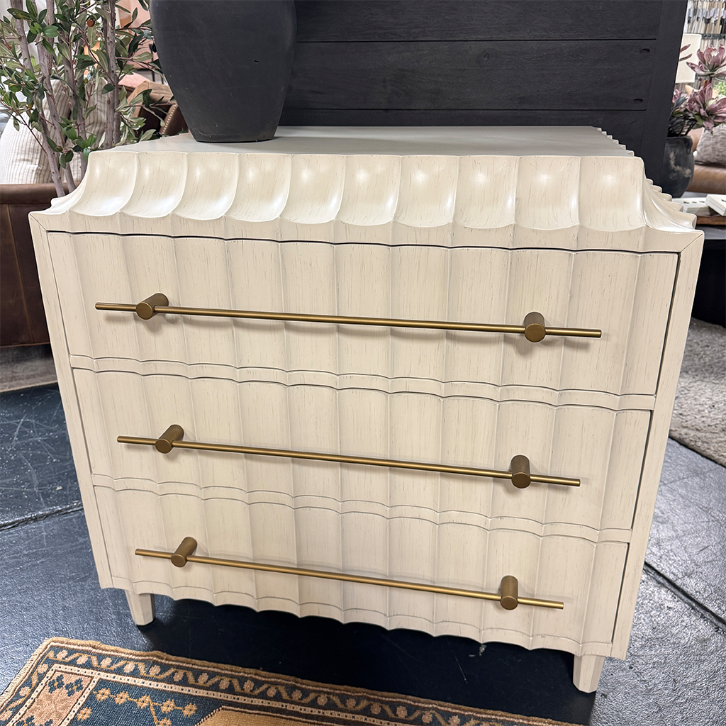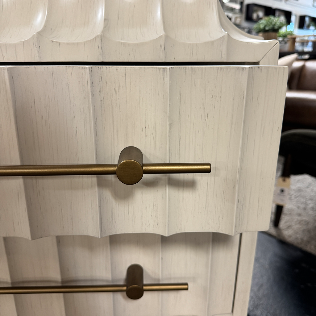 The Meri Chest reimagines the classic dresser silhouette with a bold, contemporary twist. It features exaggerated modern sculpting on the front and sides in a textured white, set against the backdrop of brushed gold linear hardware that spans the length of each drawer. The subtle contoured arch graces the top, adding an elegant detail to its striking design. This statement piece masterfully combines traditional forms with modern aesthetics, making it a captivating addition to any room