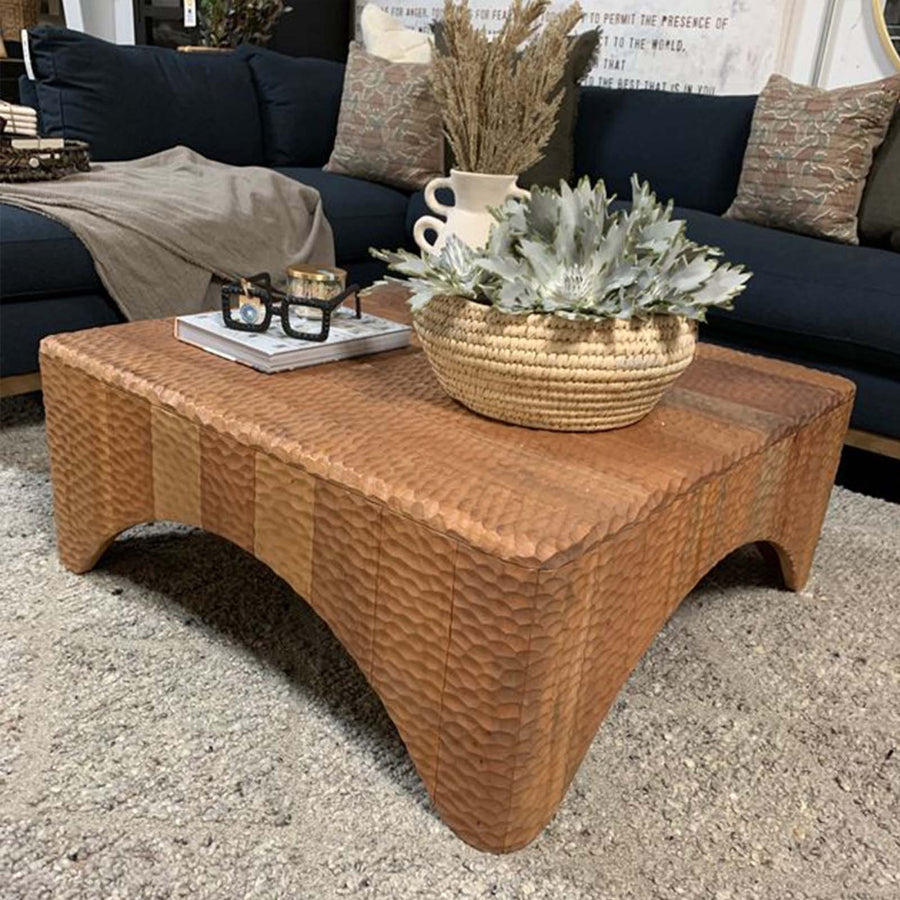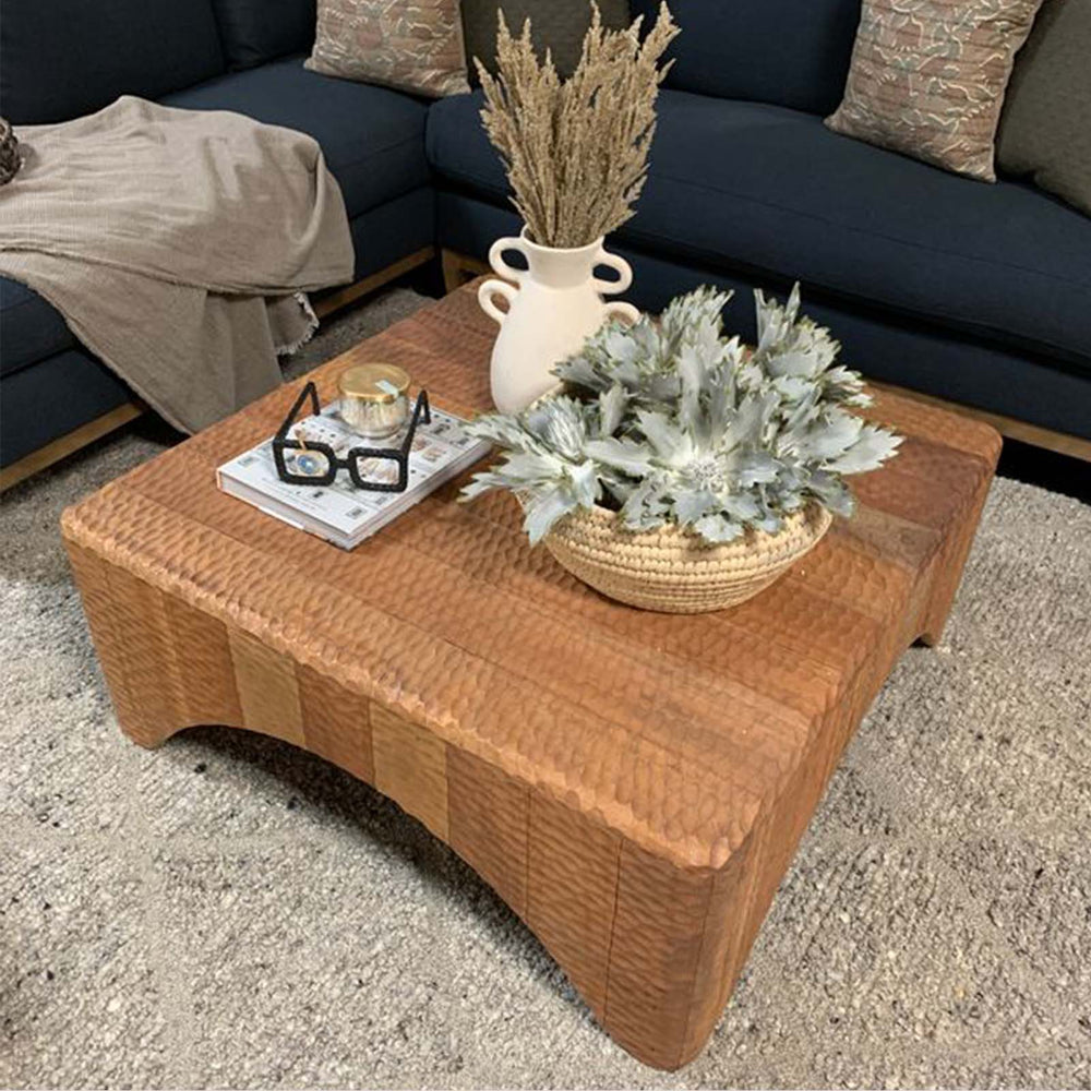 Inspired by rare 18th-century sake flasks, solid mahogany is thoughtfully hand carved, creating a textural, dimple-like look with warm, sun-bleached undertones. Unique variations to be expected, and speak to this piece's handmade nature.