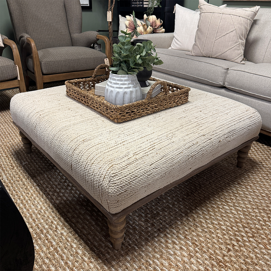 The Alder is an elegant, square-shaped bench featuring an upholstered seat braced by a four-legged mango wood base.