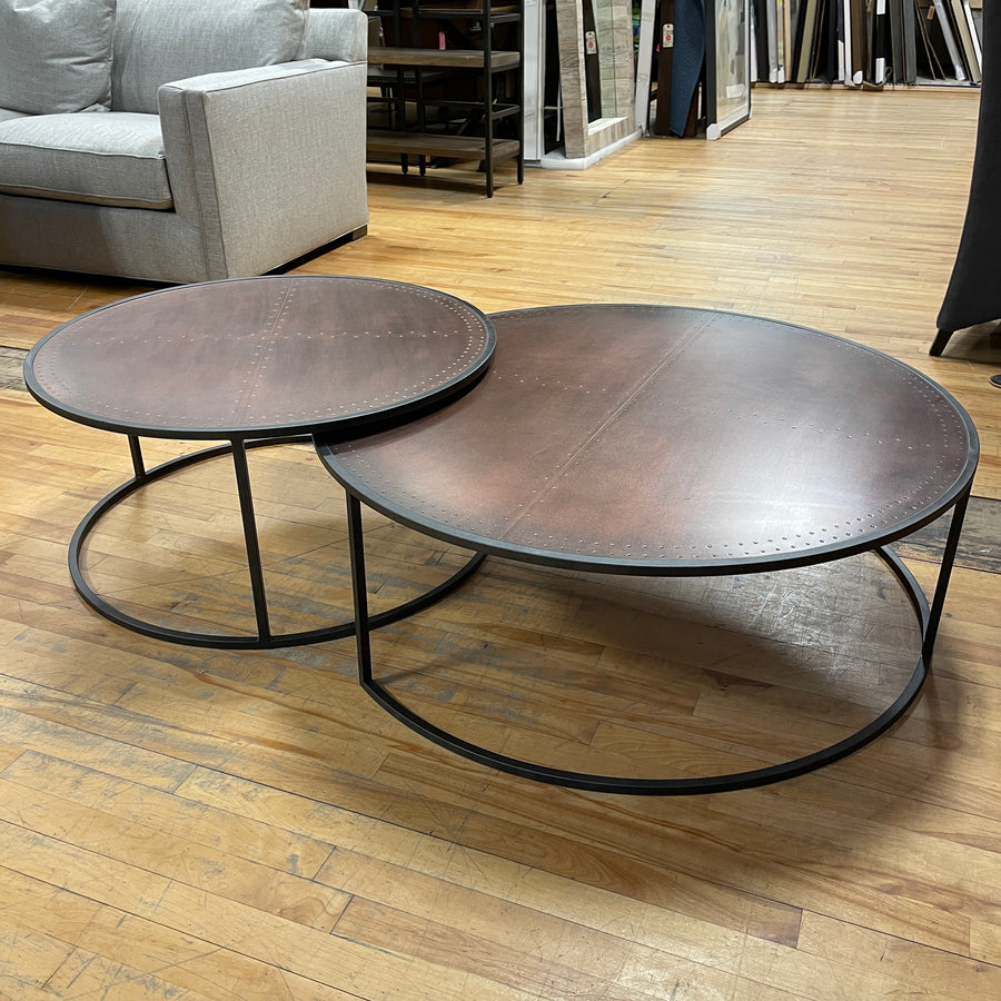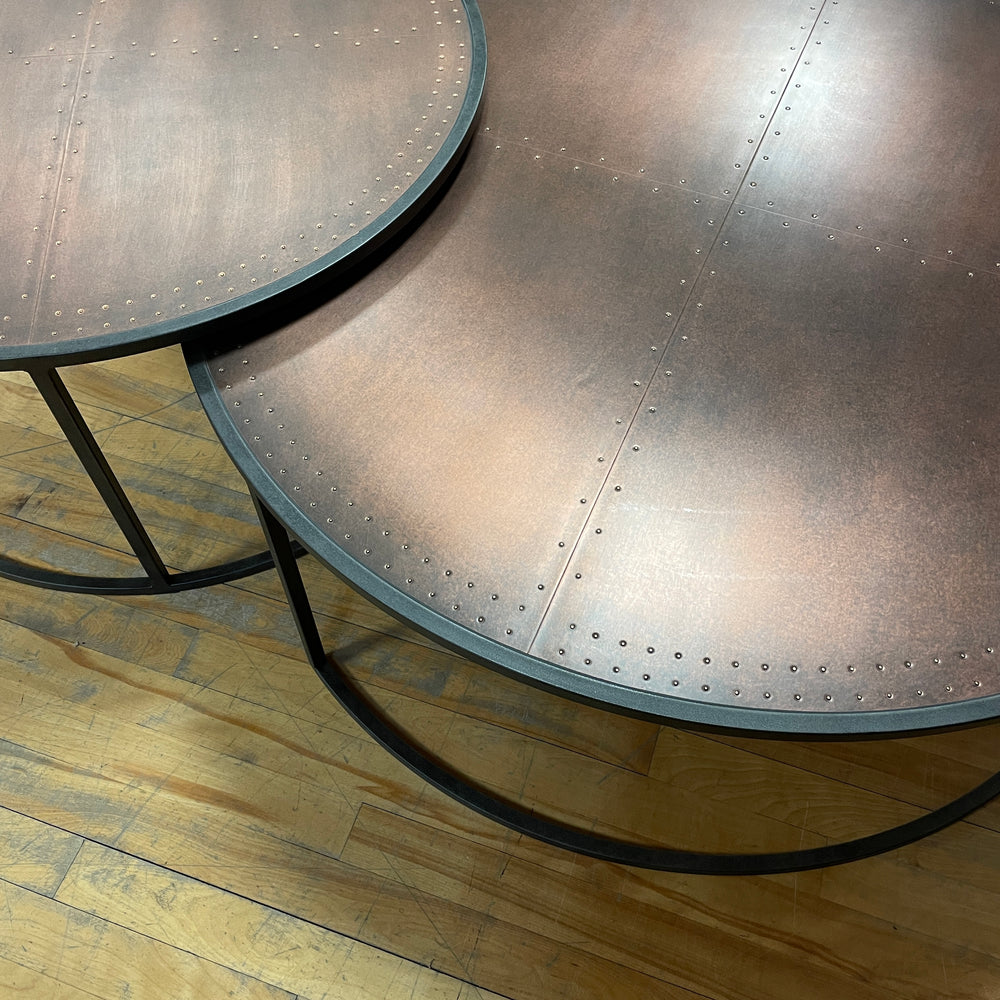 Eye-catching, entertaining layers are designed to slide together or apart, effortlessly. Slender bases support rounded, antiqued copper-clad table tops with double rows of contrasting nail heads.