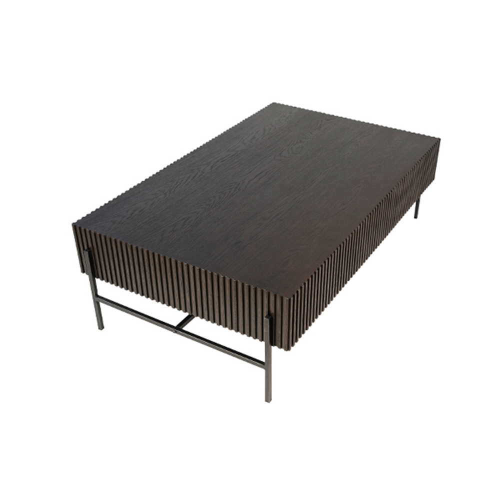 Made of reclaimed oak, the Clyde coffee table has some textural detailing and is finished in an antique brown grey stain.