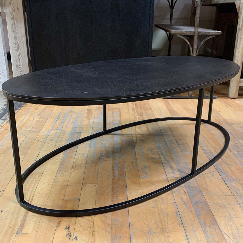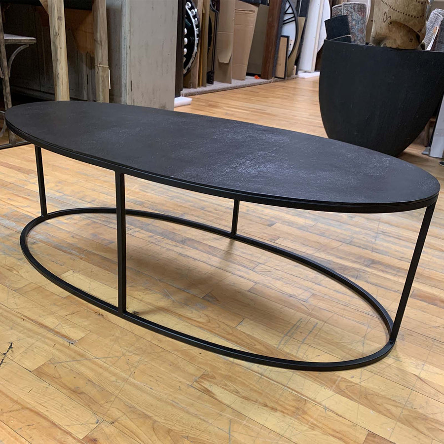 Simplistic industrial style coffee table, constructed in an aged black iron featuring a cast textured aluminum slab top finished in a plated antique black!