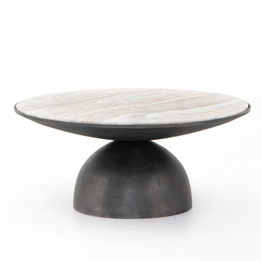 A sculptural play on shape. Hammered grey-finished aluminum base supports a grand, rounded tabletop of creamy taupe marble with beautiful natural veining.