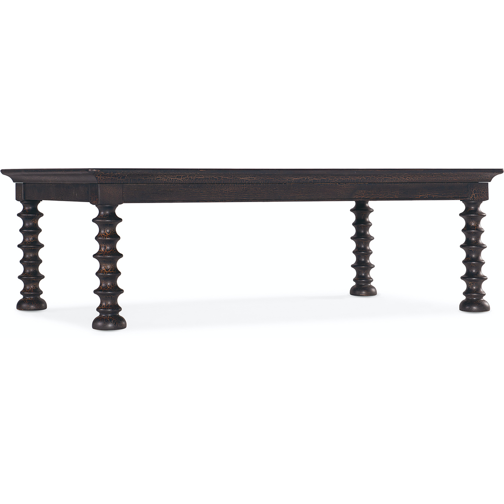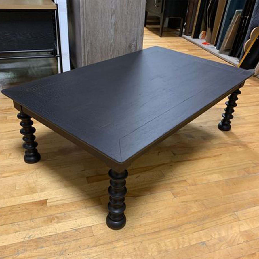 The Dina coffee table is made of a distressed black wood and has unique details like the turned legs.