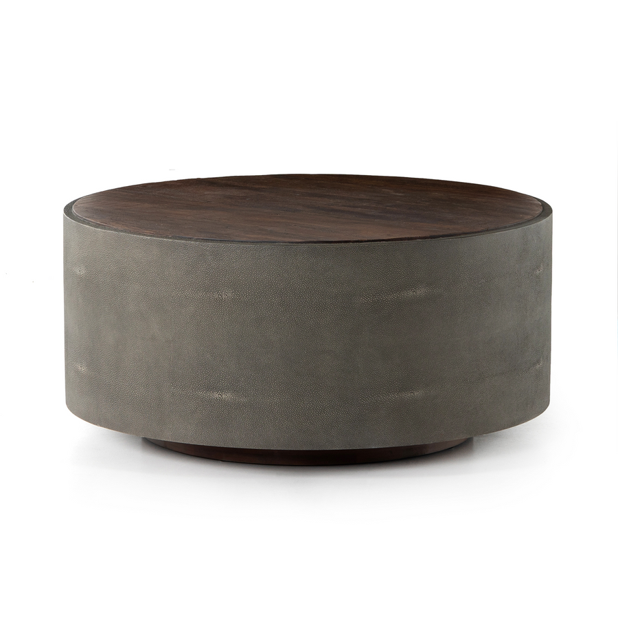 Mixed materials and the simplest of shapes offer a dramatic centerpiece for any space. Reclaimed peroba wood is supported by a textural faux shagreen base in soft grey!