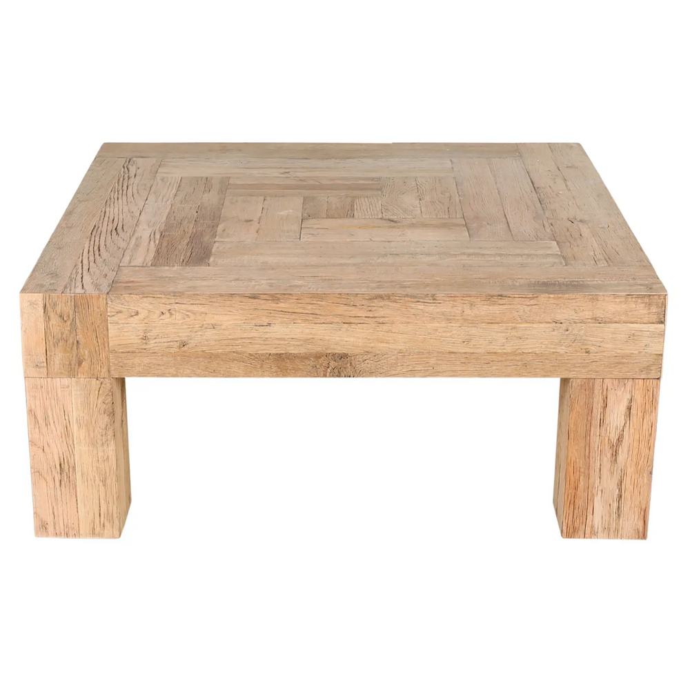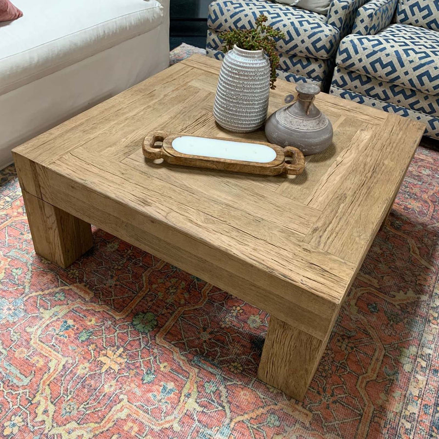 Formed from solid reclaimed oak, the Evelyn coffee table features wild grains and knots, producing a unique surface alongside its modern, blocked construction.