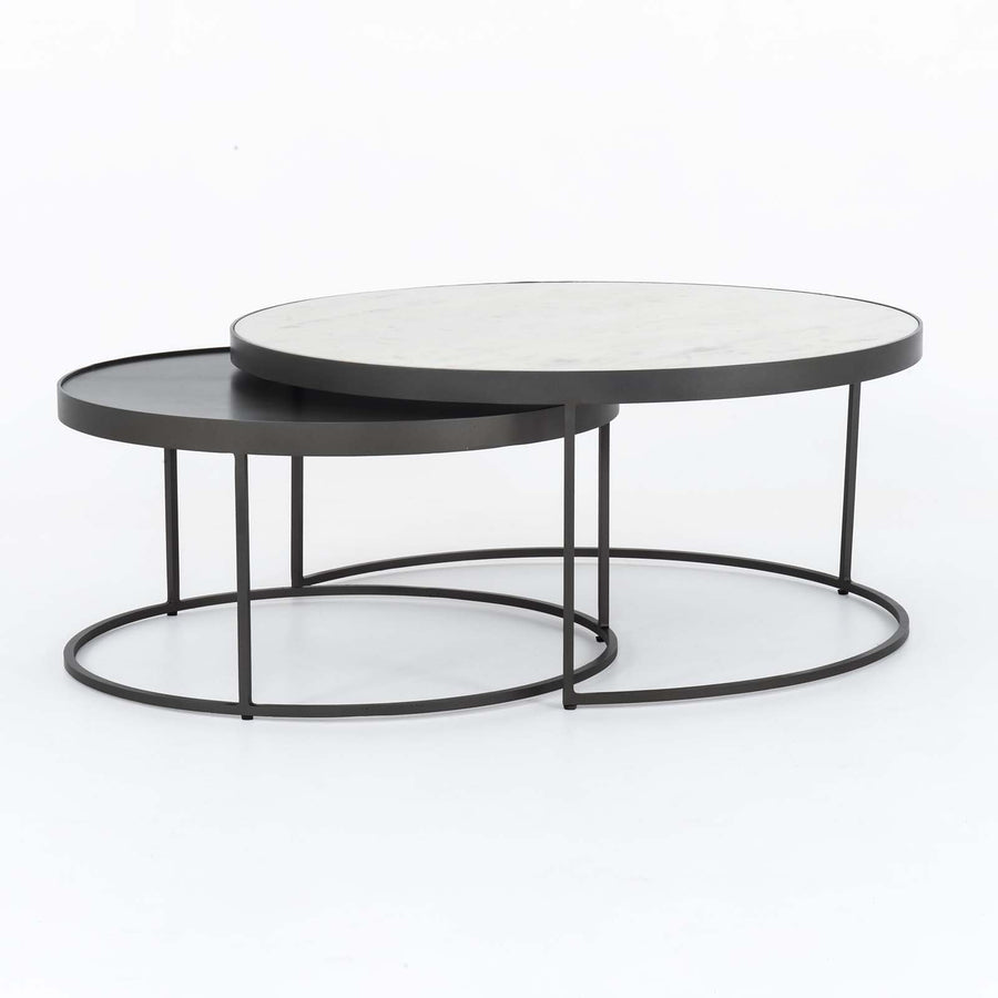 Stacked and structured, slim iron lends edge to the sophistication of polished white marble. Nesting feature for compact functionality and modern, adaptable appeal.