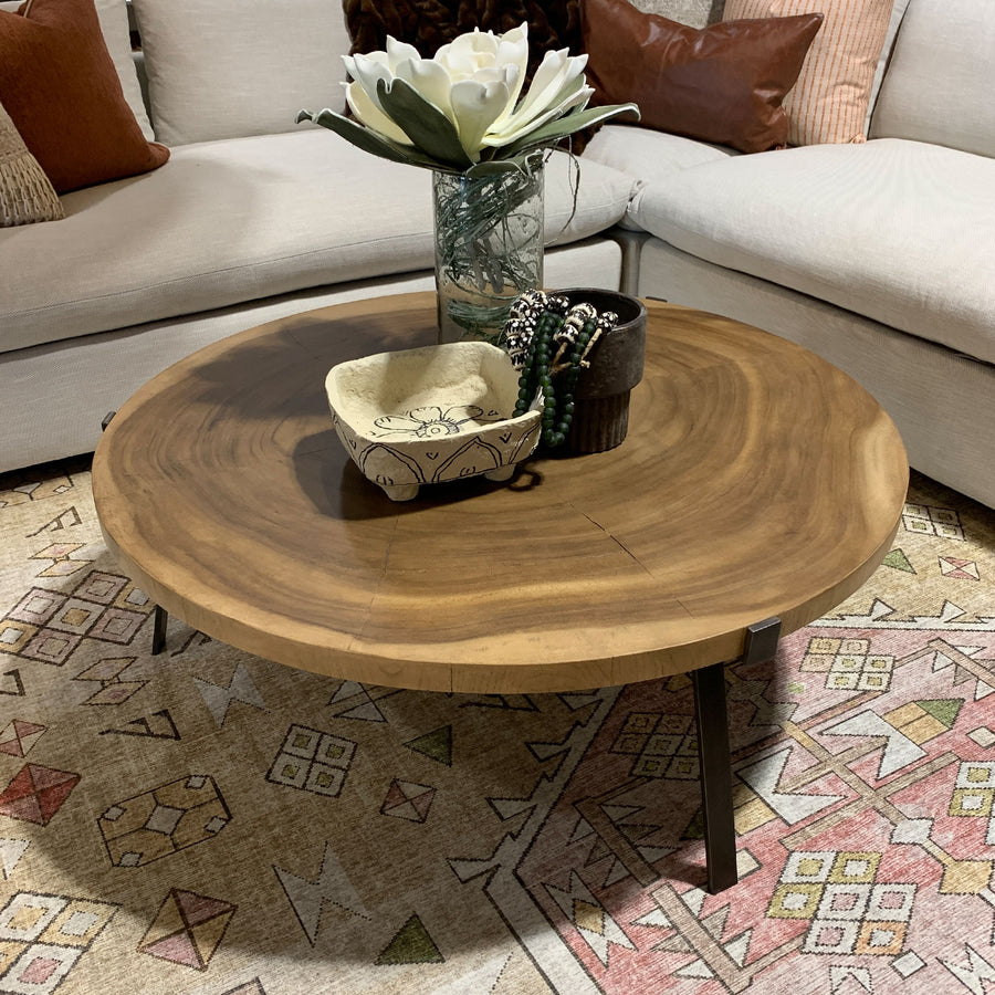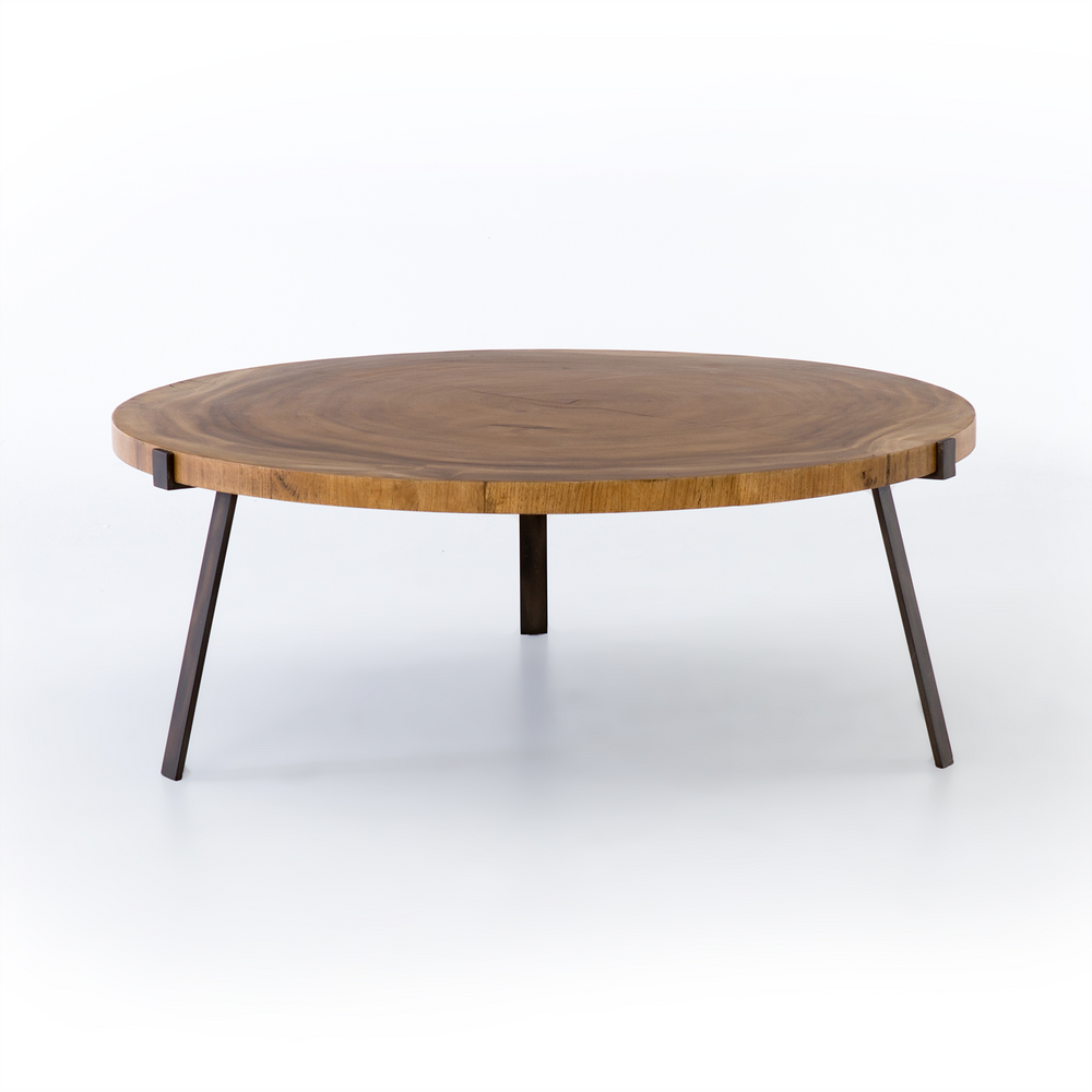 Blonde guanacaste wood is rounded and inset in bronzed iron-finished metal for a modern-minimalist look with contrasting warmth. Woods' natural knots and oyster-cut graining reveal organic texture to defy simple shaping.