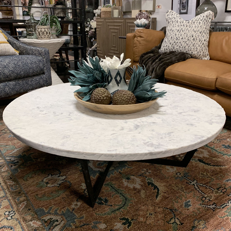 A raw, rustic iron base supports a round, white marble top, which is sandblasted for textured nuance and sophisticated polish.