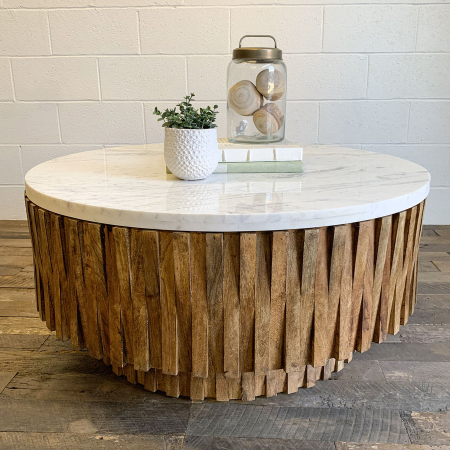 Light acacia wood is layered to create a textured design on the base of the Miles coffee table. This edition is topped with a smooth marble disc to create a clean slate that showcases your favorite accessories.