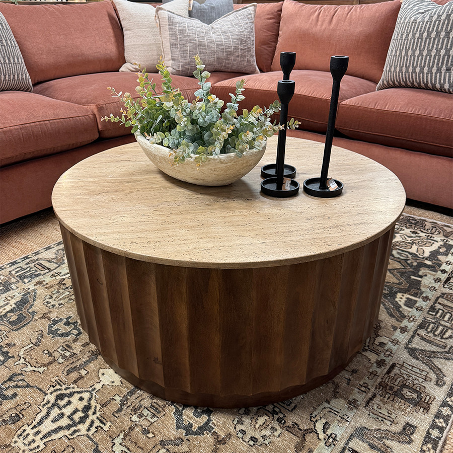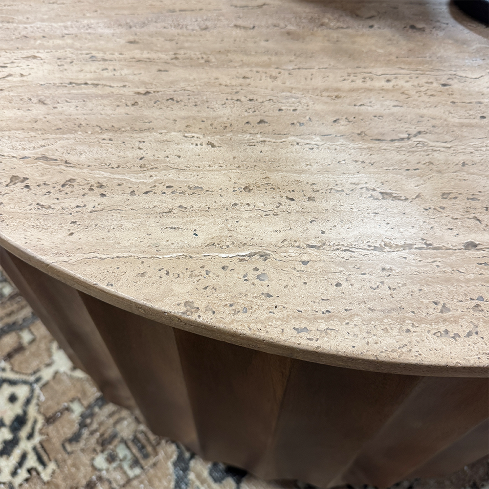 Beautifully shaped and colored, the Milly coffee table has a natural travertine top.