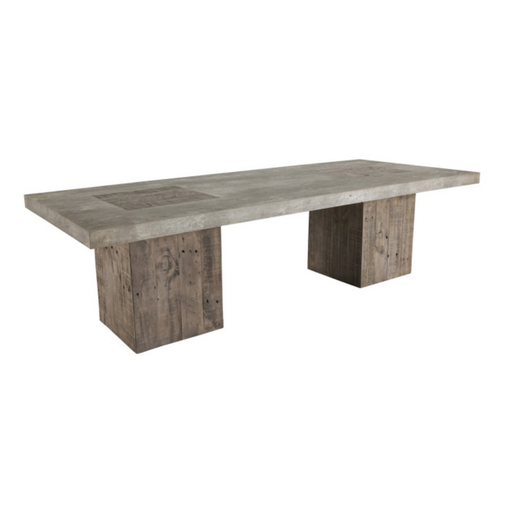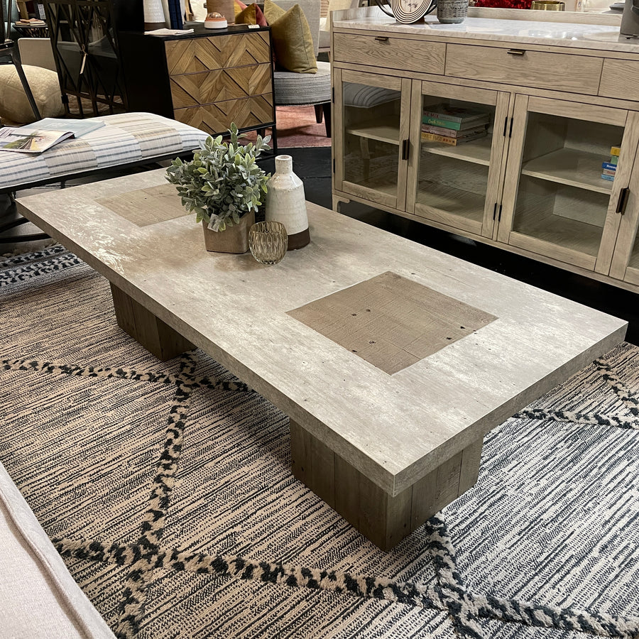Bring texture and character to your space with this bold coffee table constructed from reclaimed pine wood and an exceptionally durable, lightweight concrete laminate top!