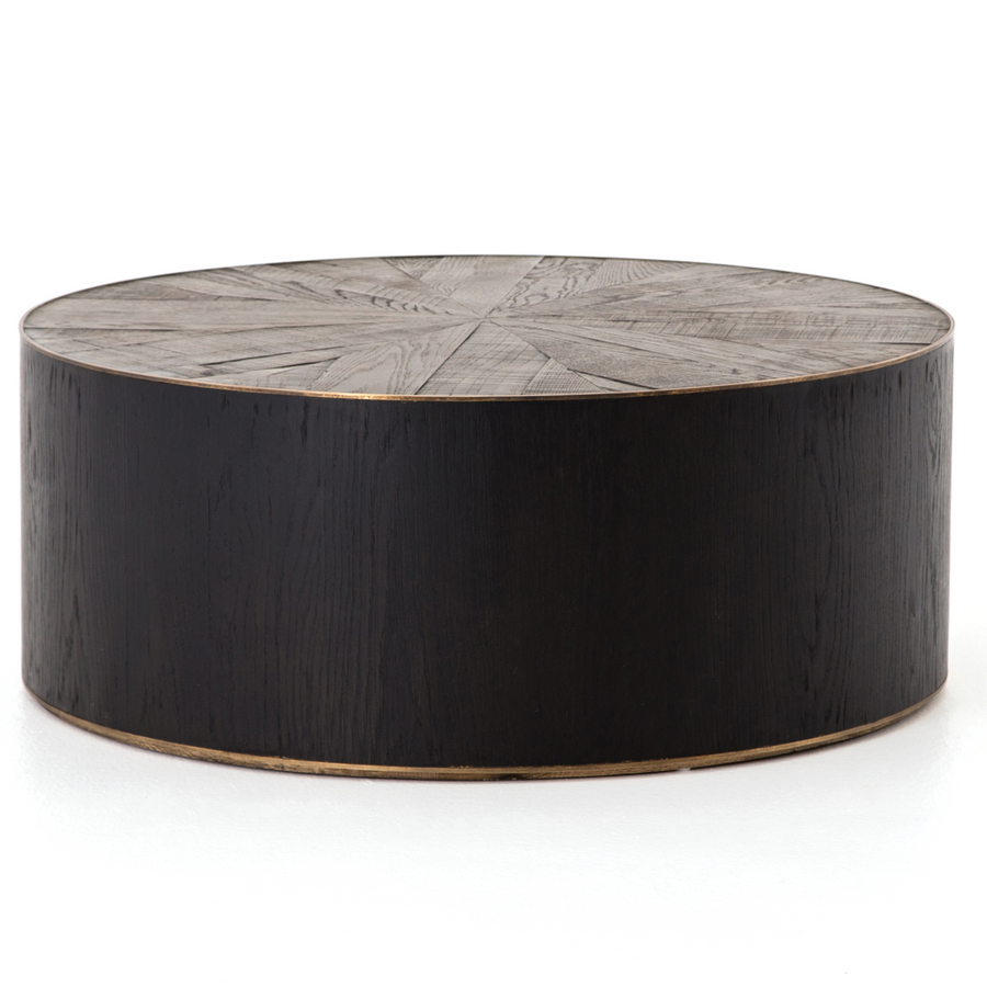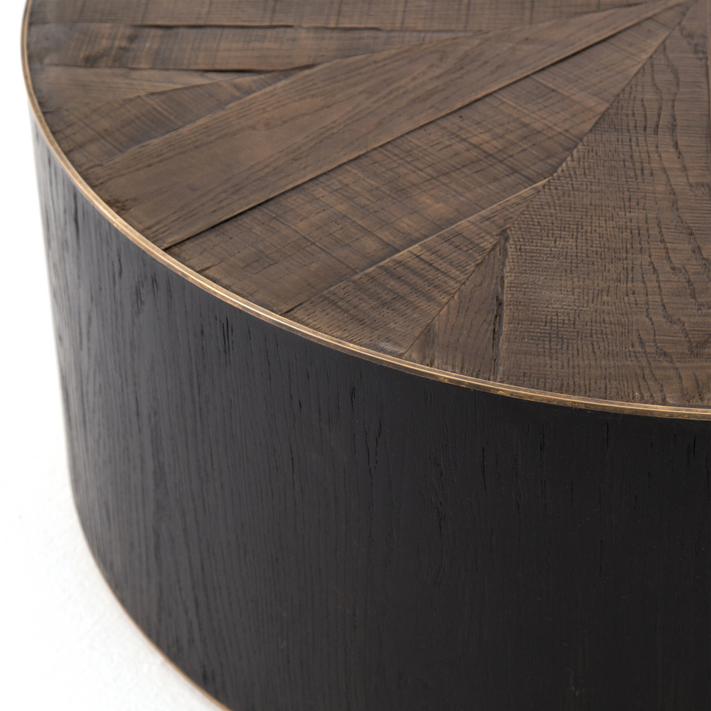 A deep brown oak top is cut in a starburst texture, framed by deep ebony sides, and encircled by bright brass rings.