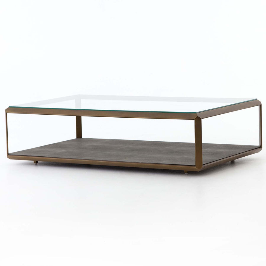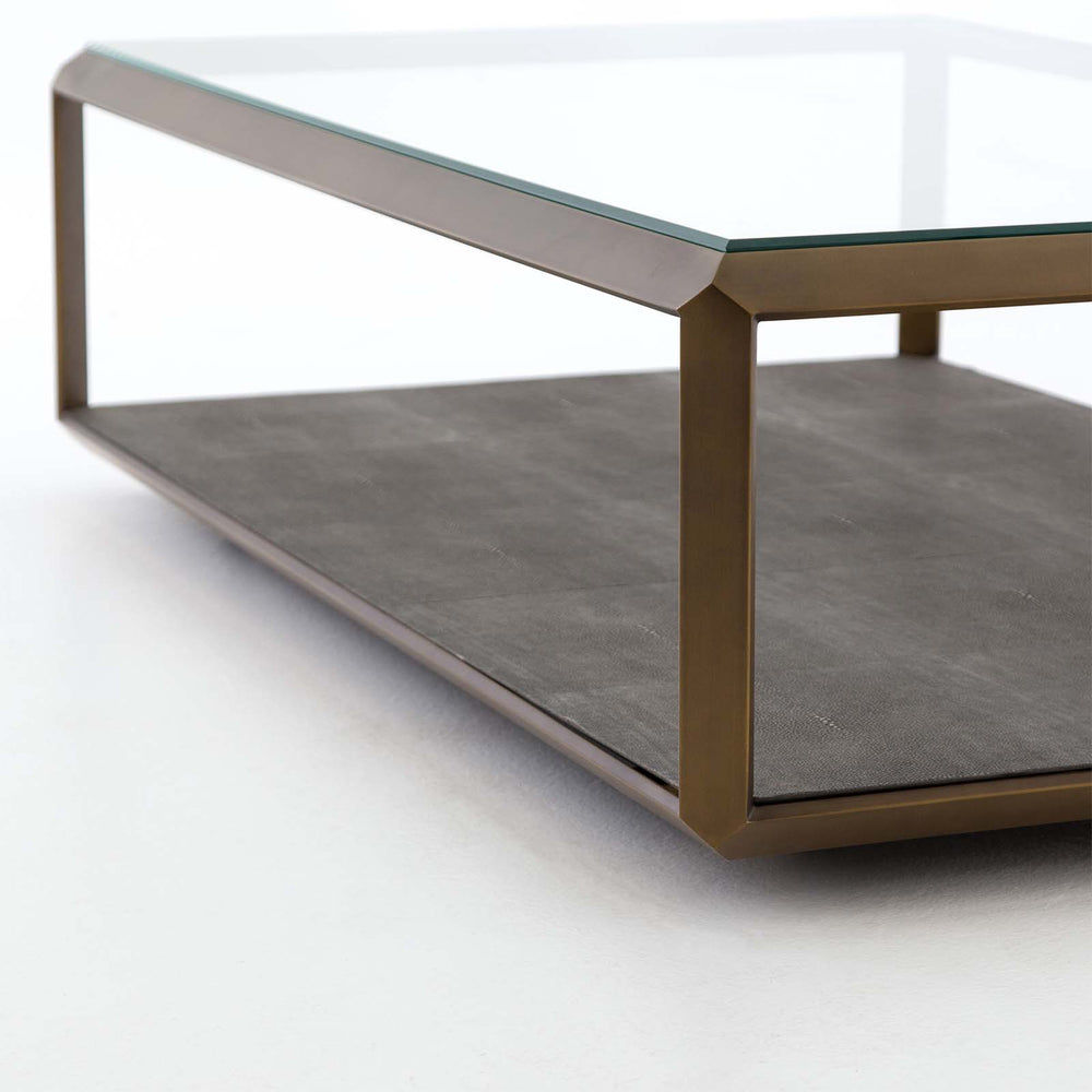 A layer of grey faux shagreen sets an intriguing textural backdrop for prized possessions. Antique brass-finished iron framing and low styling places a fresh, functional spin on the traditional shadowbox.