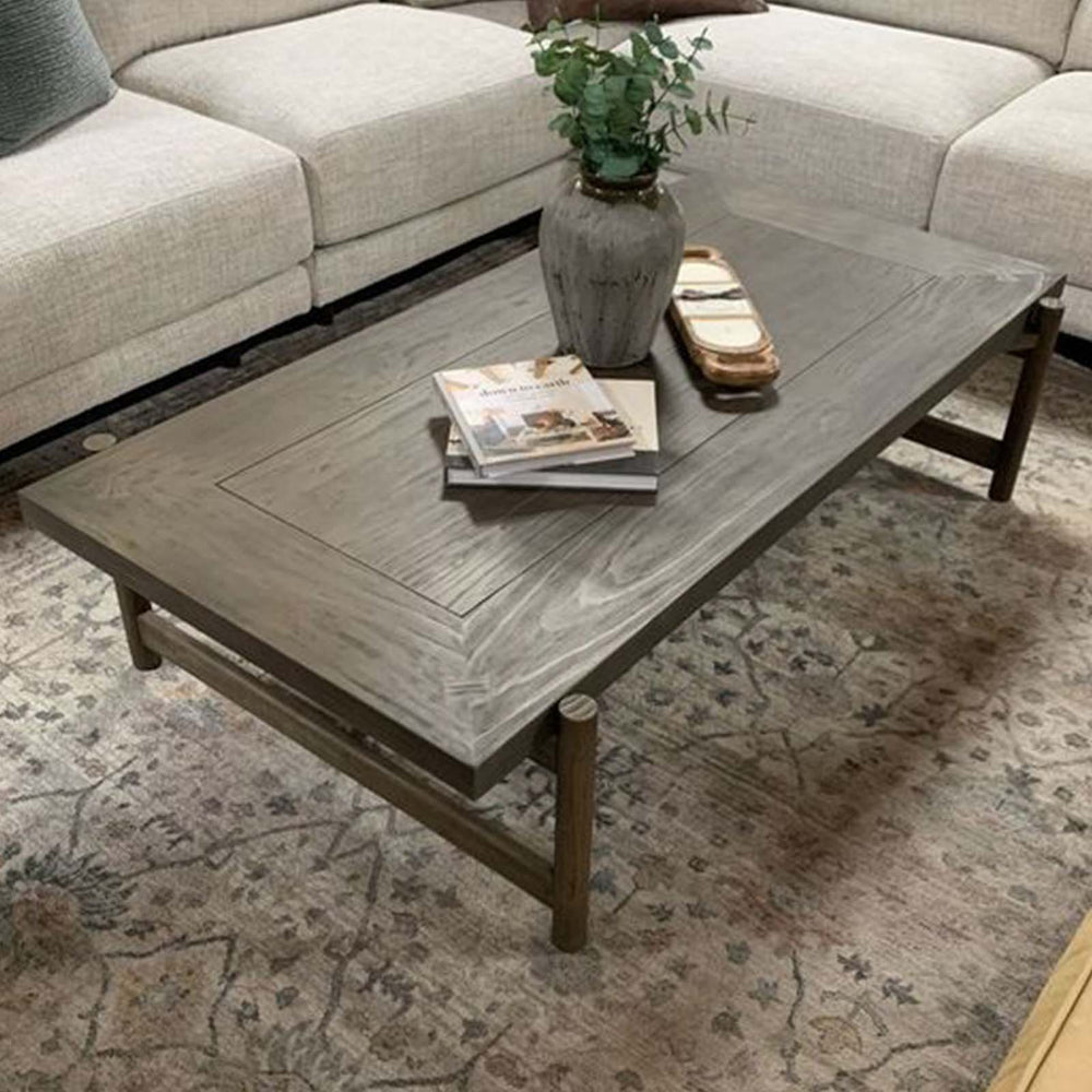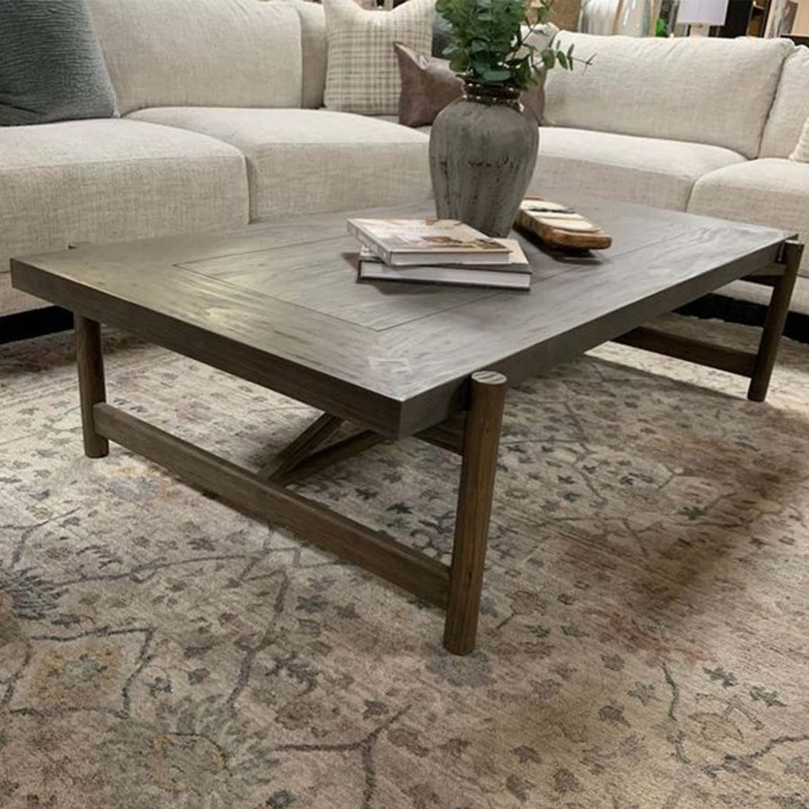 Hardworking industrial furniture inspired the hefty proportions of the Tiffany coffee table. Structured, clean lines with exposed metal hardware add warm contrast.