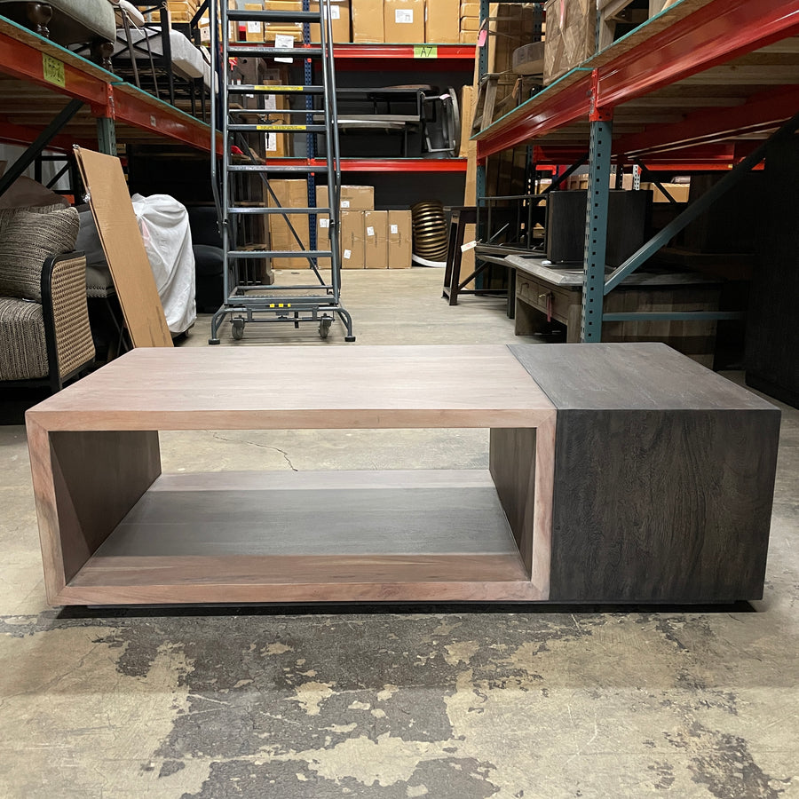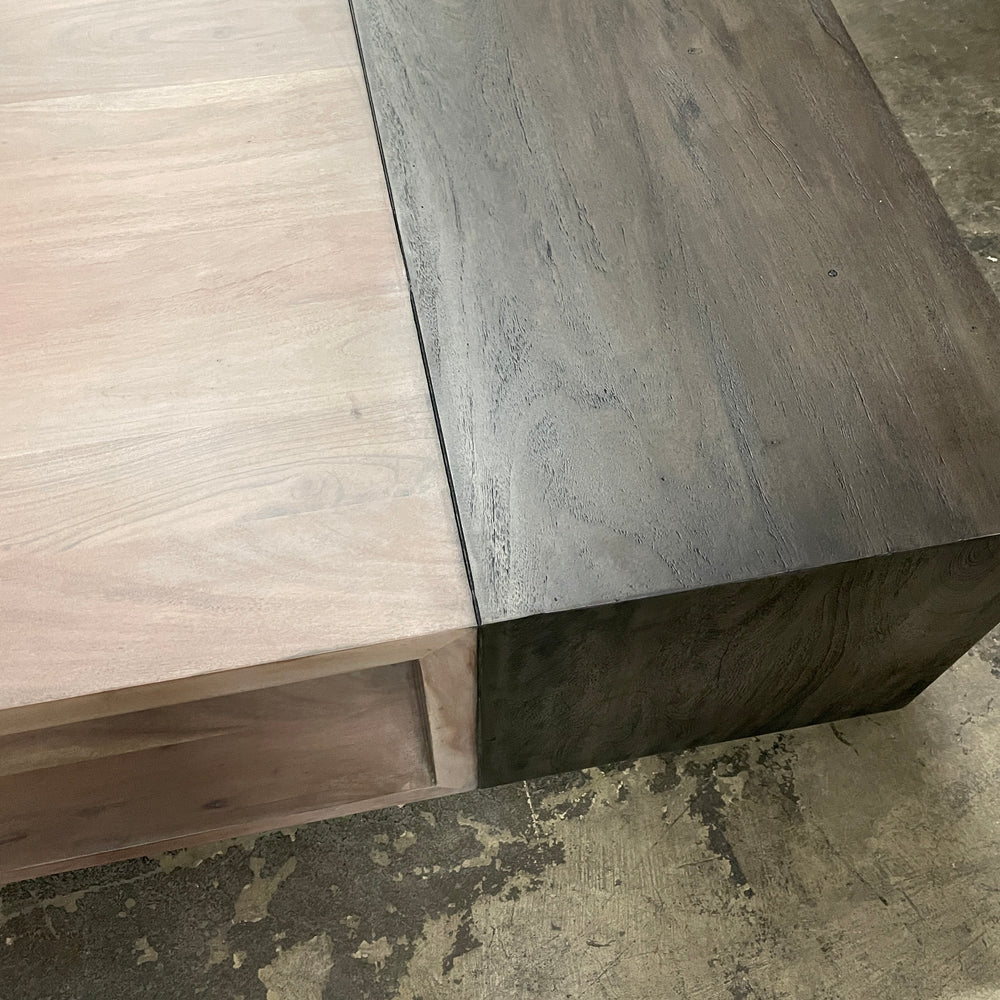 Another fine example of cubism in design, the Tifton Coffee Table features a plethora of storage options to keep your living room clean and organized. Made from solid acacia wood, the Tifton collection is features a light cloudy and metal grey finish, giving each product depth within its space.