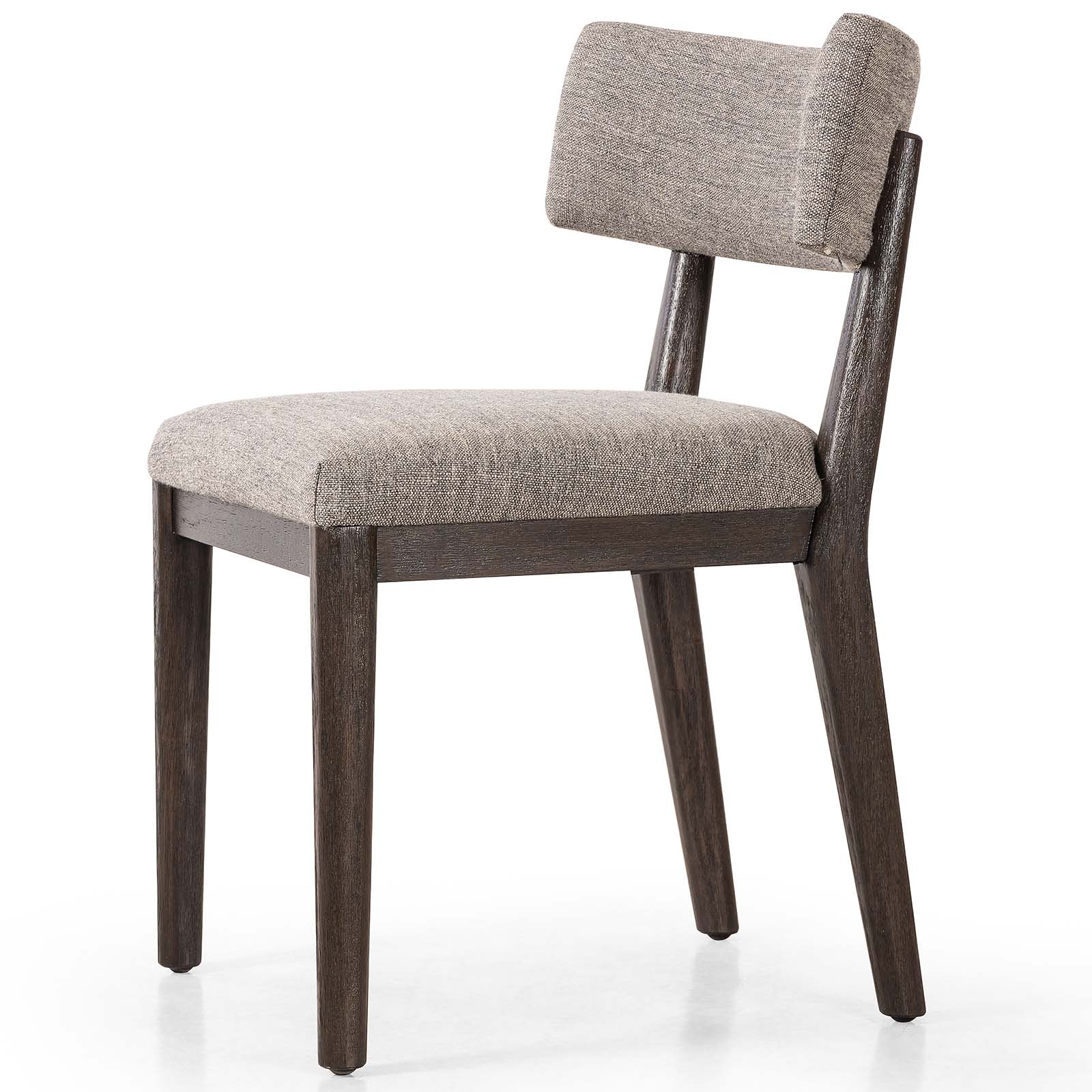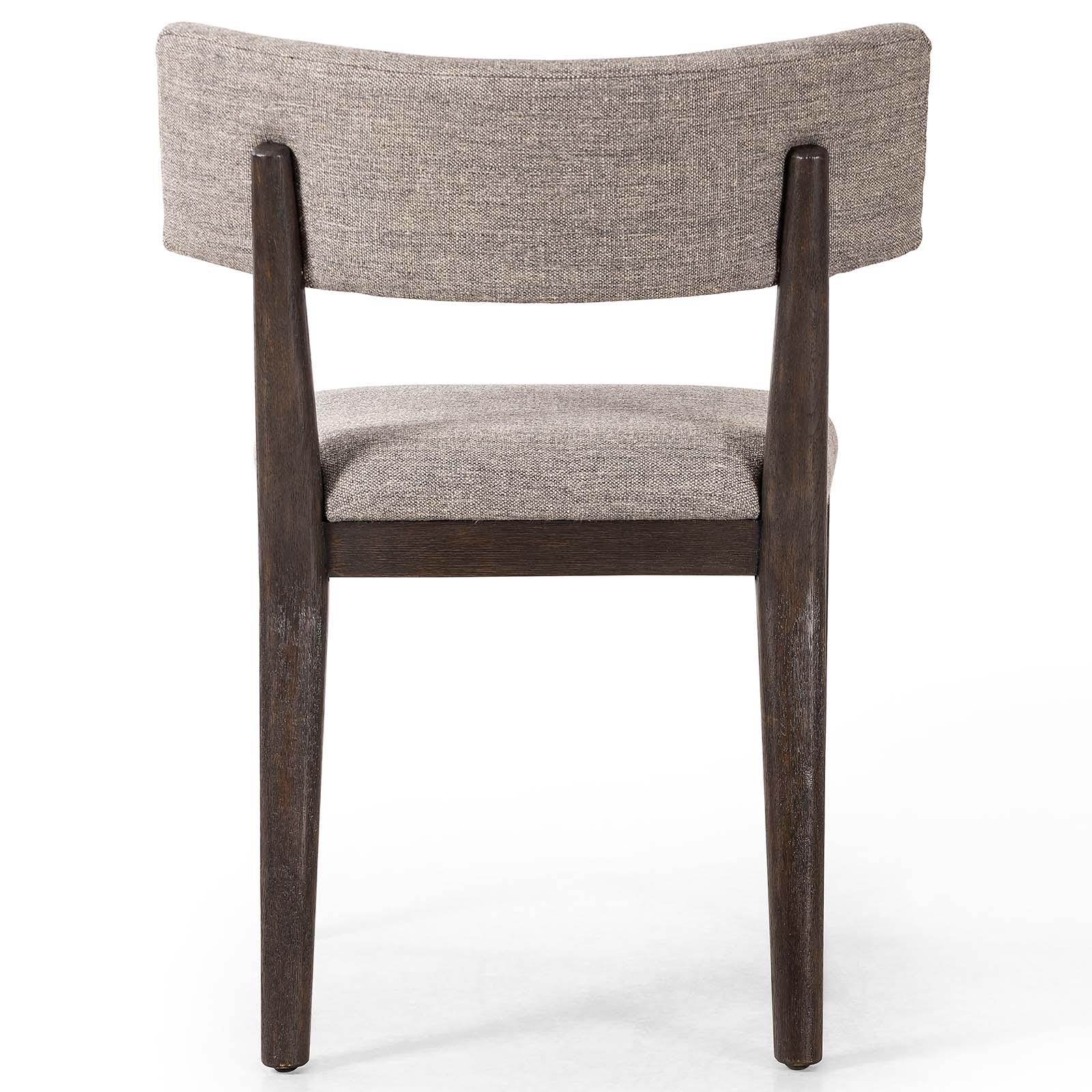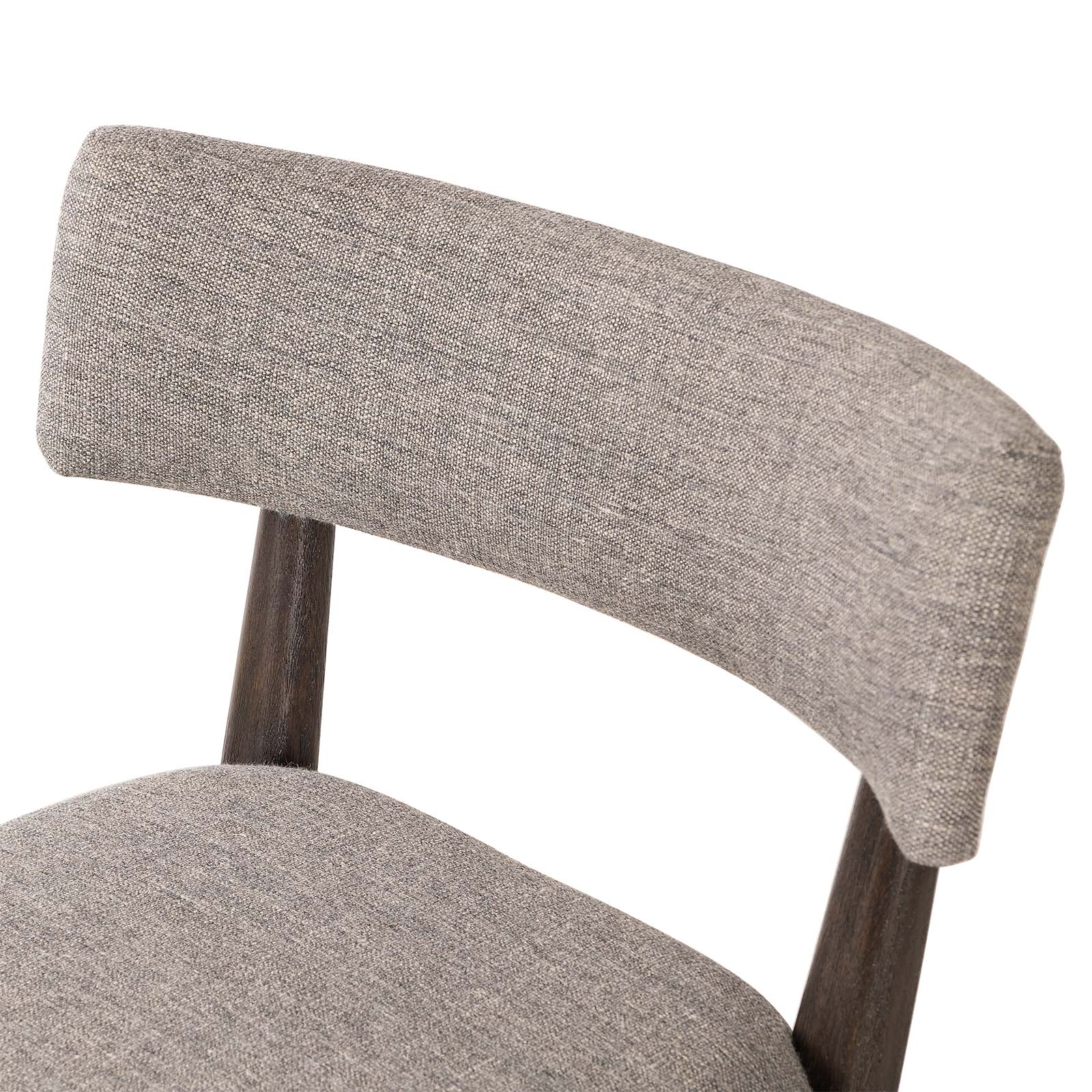 Burnt parawood forms a curved barrel back for a shapely take on everyday dining, with textural fabric that moves between styles with ease.