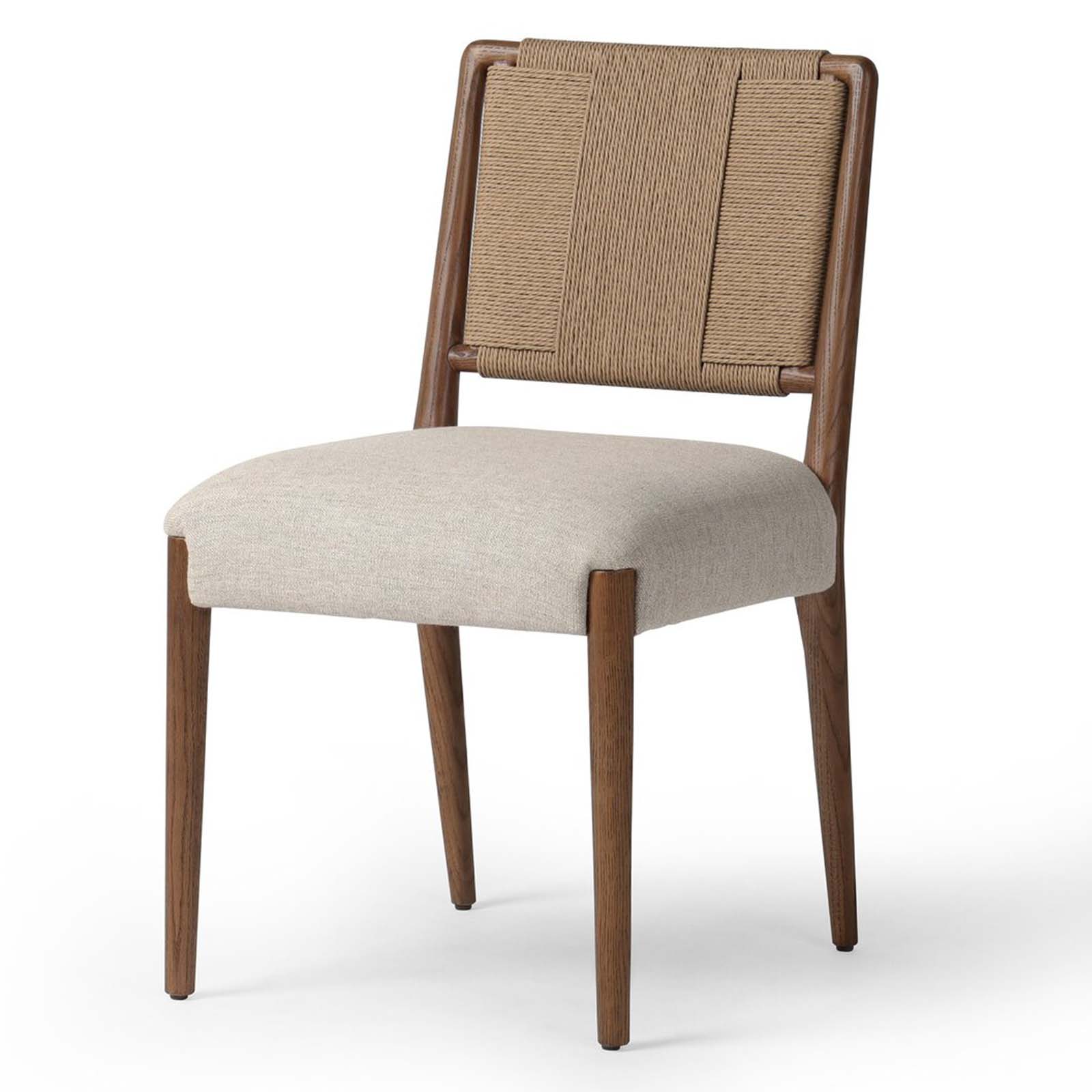 Mixed materials elevate the everyday dining chair. Alternating weave patterns on the seat's back add texture and visual interest, while a thick cushioned seat upholstered in high-performance fabric ensures a comfortable sit.