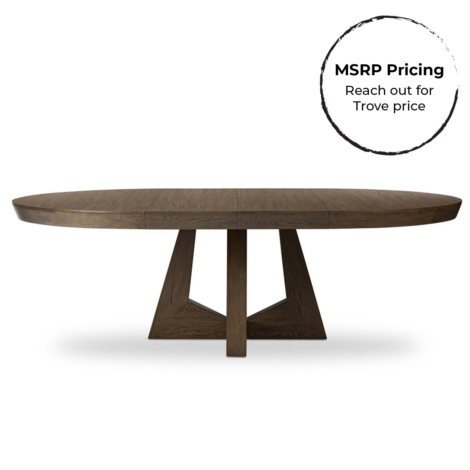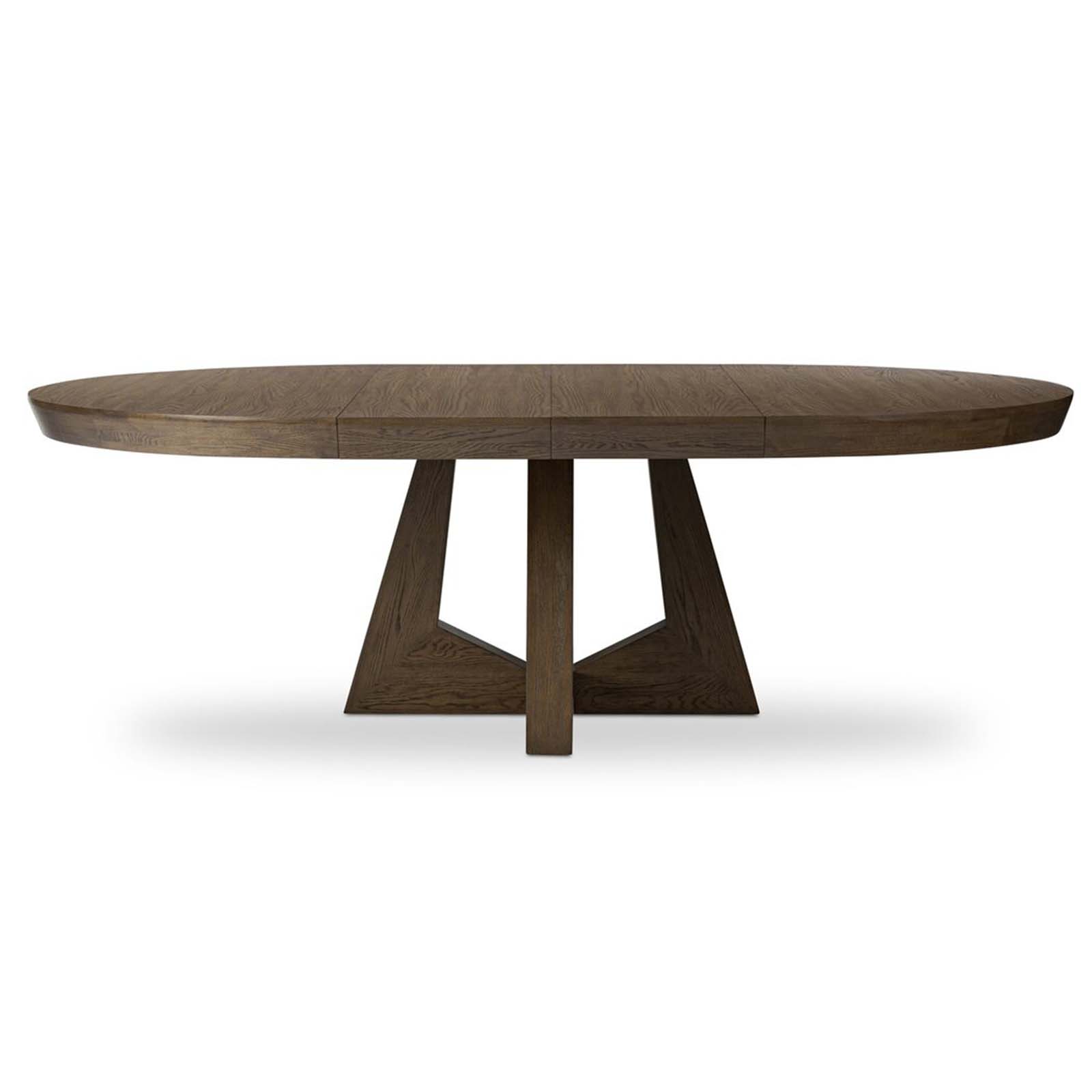 Sculptural angles define this expansive oak dining table, as angled cutouts play up a tapered base and top.