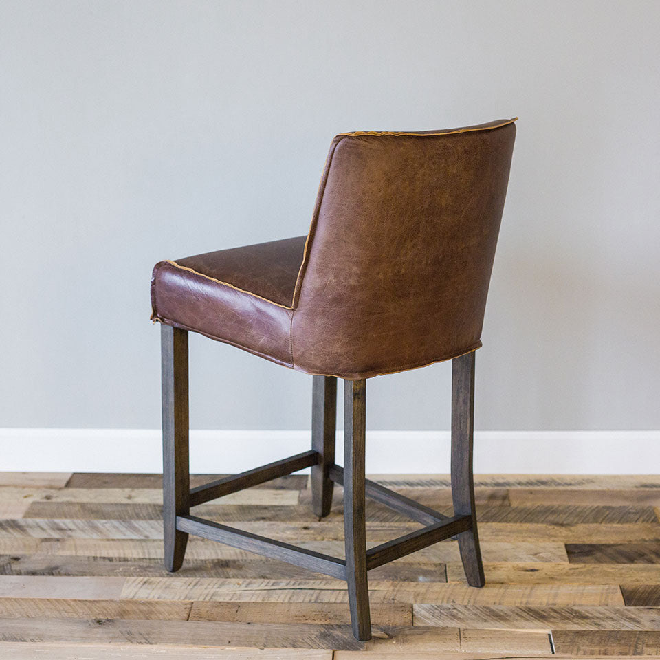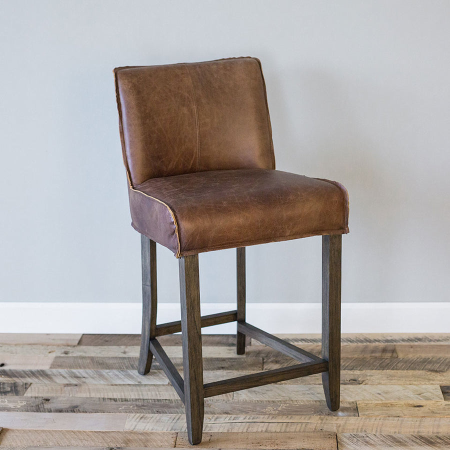Raw-edged top grain leather is wrapped around a supportive cushioned seat on the Adlee Counter Stool. They sit on delicately flared solid wood legs to bring a gently rustic feel to any space.