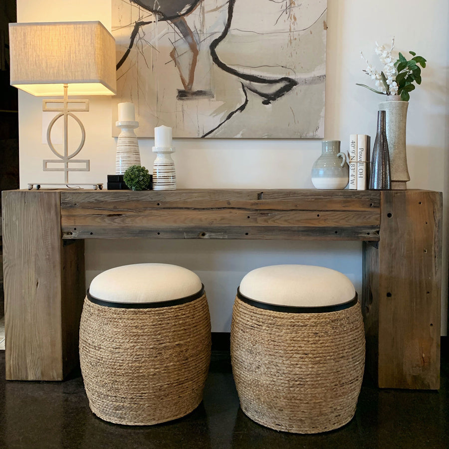 One of a kind sofa table constructed from recycled, reclaimed boat wood collected from old Chinese fishing vessels.