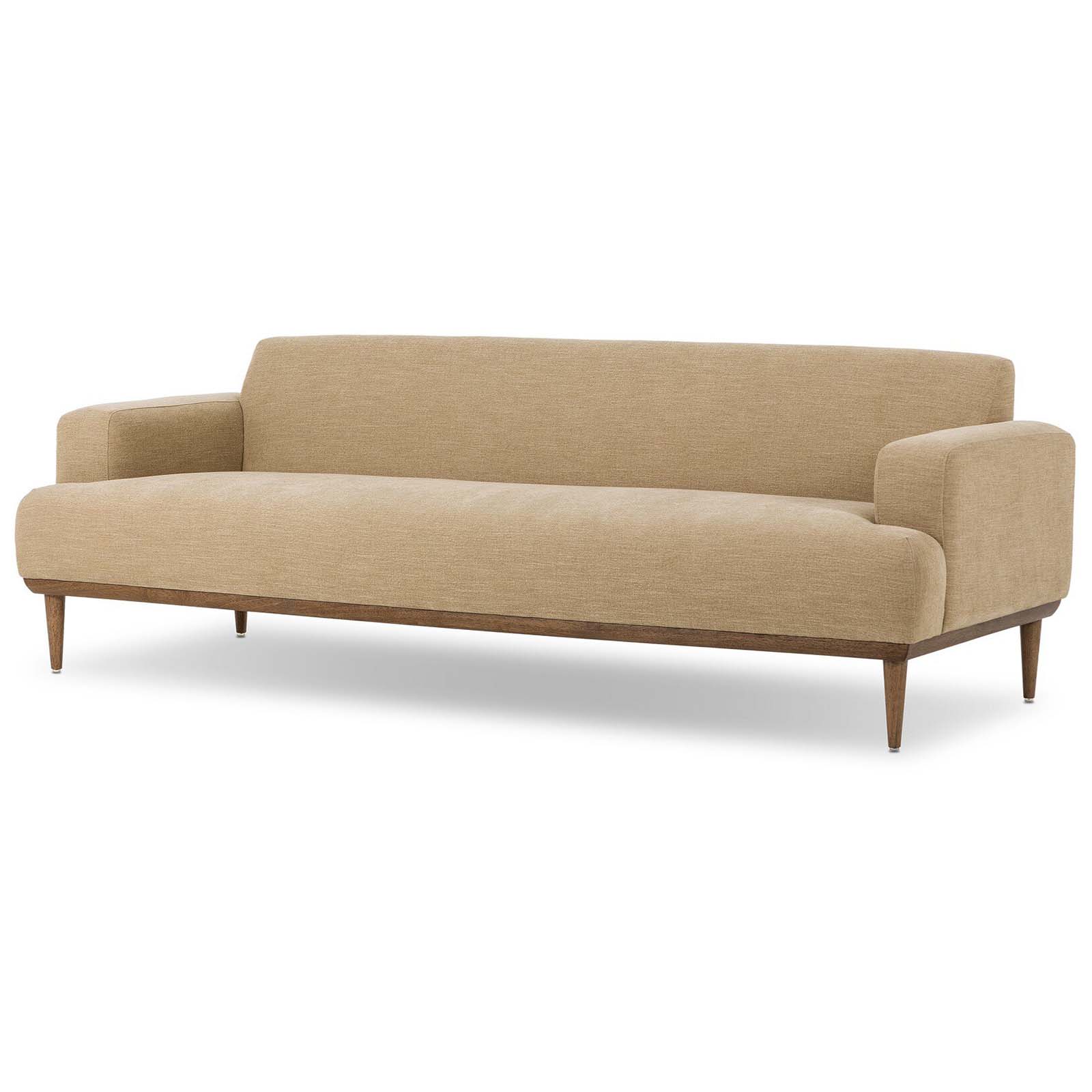 This fully upholstered sofa has a rounded wood base, classic track arms and tapered legs for a touch of midcentury modern. Fixed back with a loose T-cushion bench in a poly-linen textile fabric.