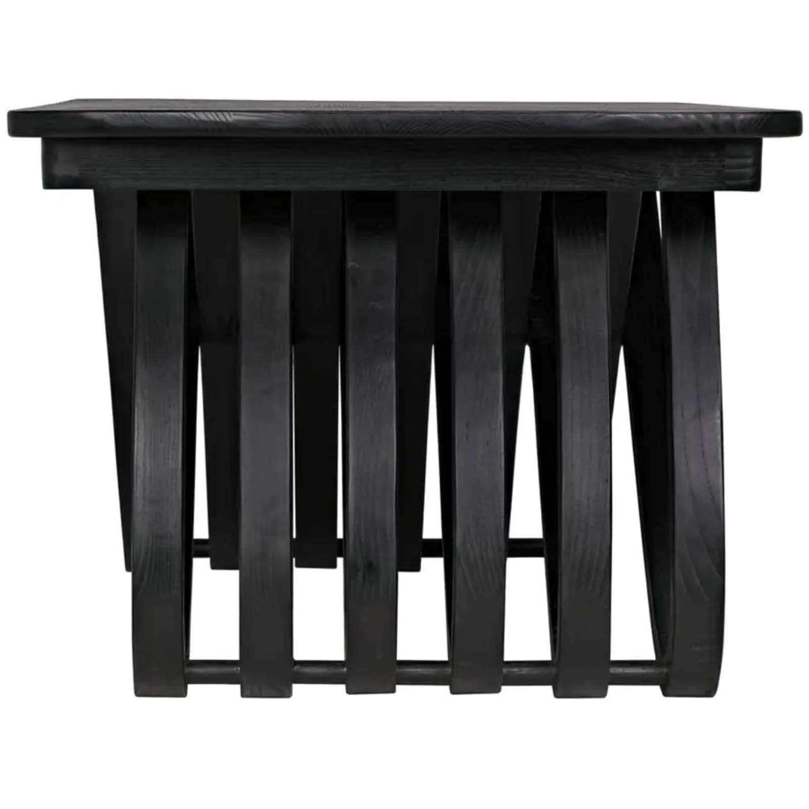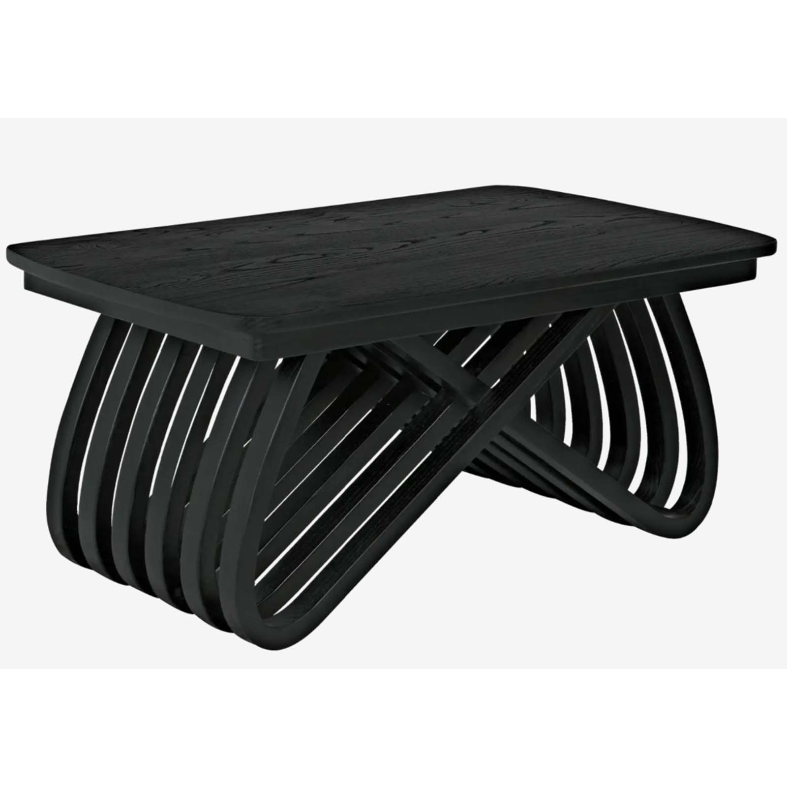 Handcrafted from wood, the Infinity Coffee Table combines a simple plank top with a kinetic, repeating pretzel-style base featuring a black finish that highlights the subtle grain.