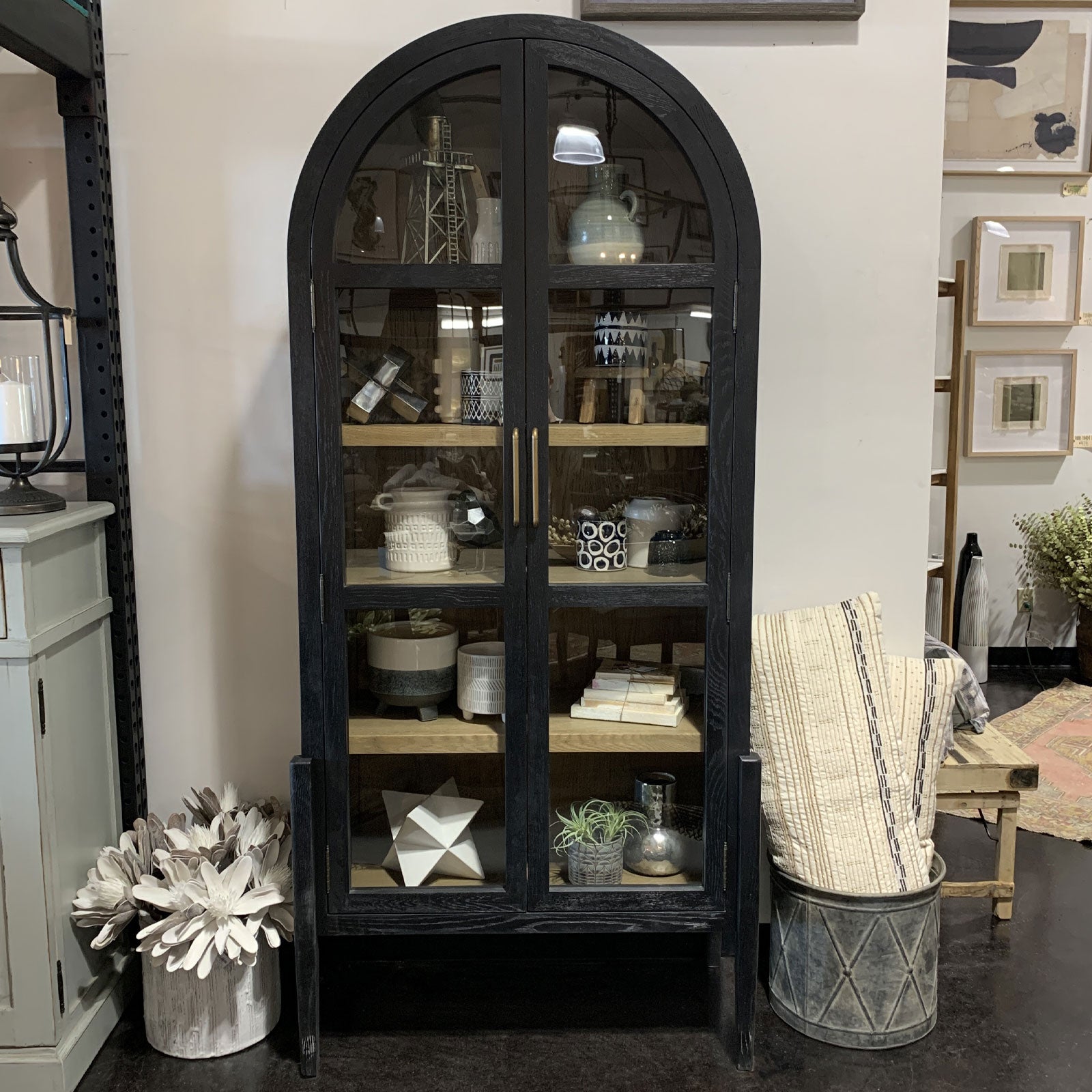 Beautifully shaped cabinetry of black solid oak features spacious interior shelving and clear glass front, ready for displaying favorite books, photos and treasures.