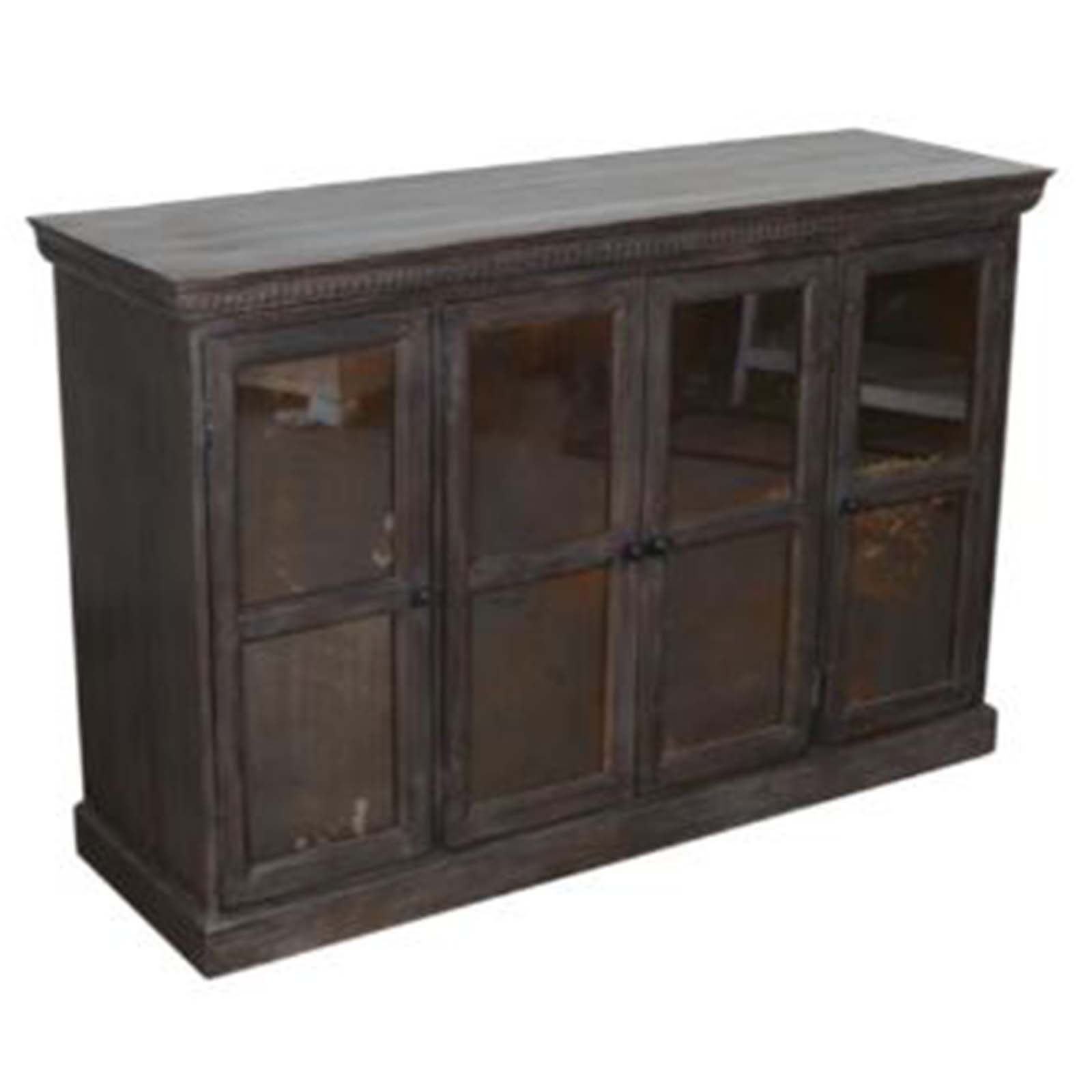 A console adorned with vintage-washed glass creates a unique and timeless appeal. The four-door spacious cabinet, crowned with a cornice top and supported by a simple base frame, embodies the perfect balance of elegance and simplicity.