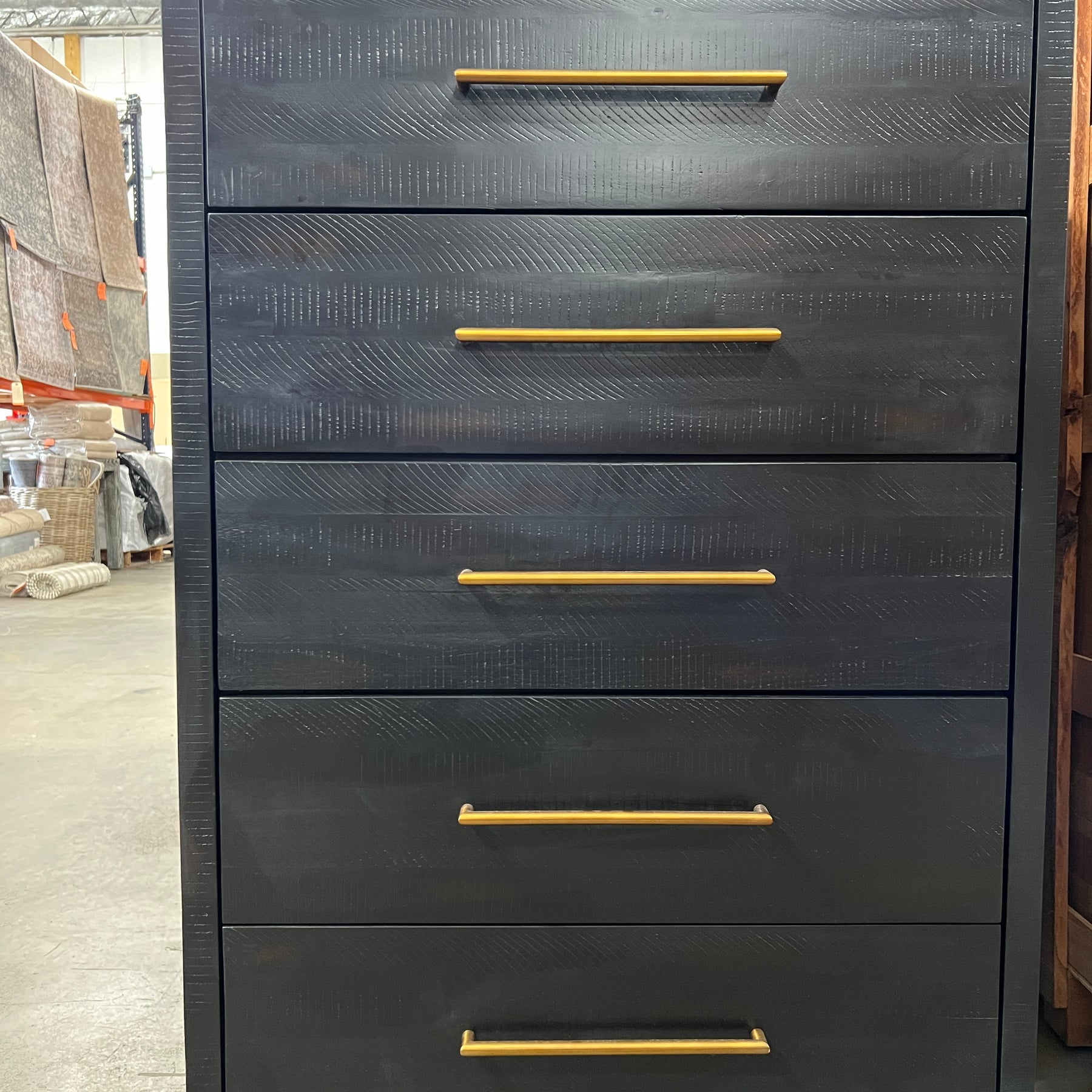 Simple sophistication with a modern edge. Clean lines lighten the natural depth of a burnished black finish. Brass-finished hardware adds a sleek touch to five spacious drawers.