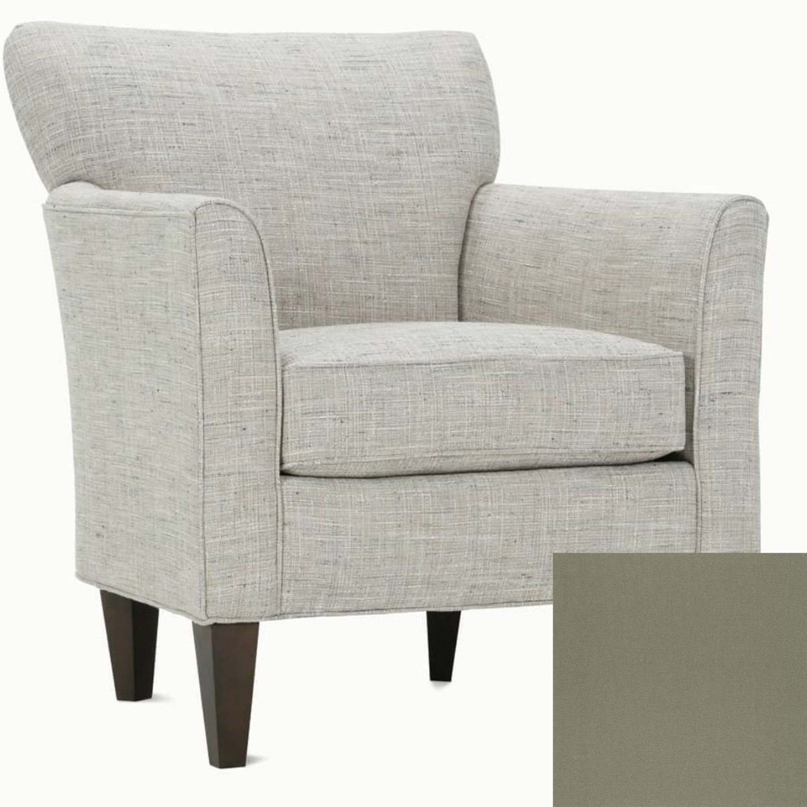 The Times Square Chair is a stationary design wrapped in a soft sage green fabric, offering a modern yet inviting touch to any living space.