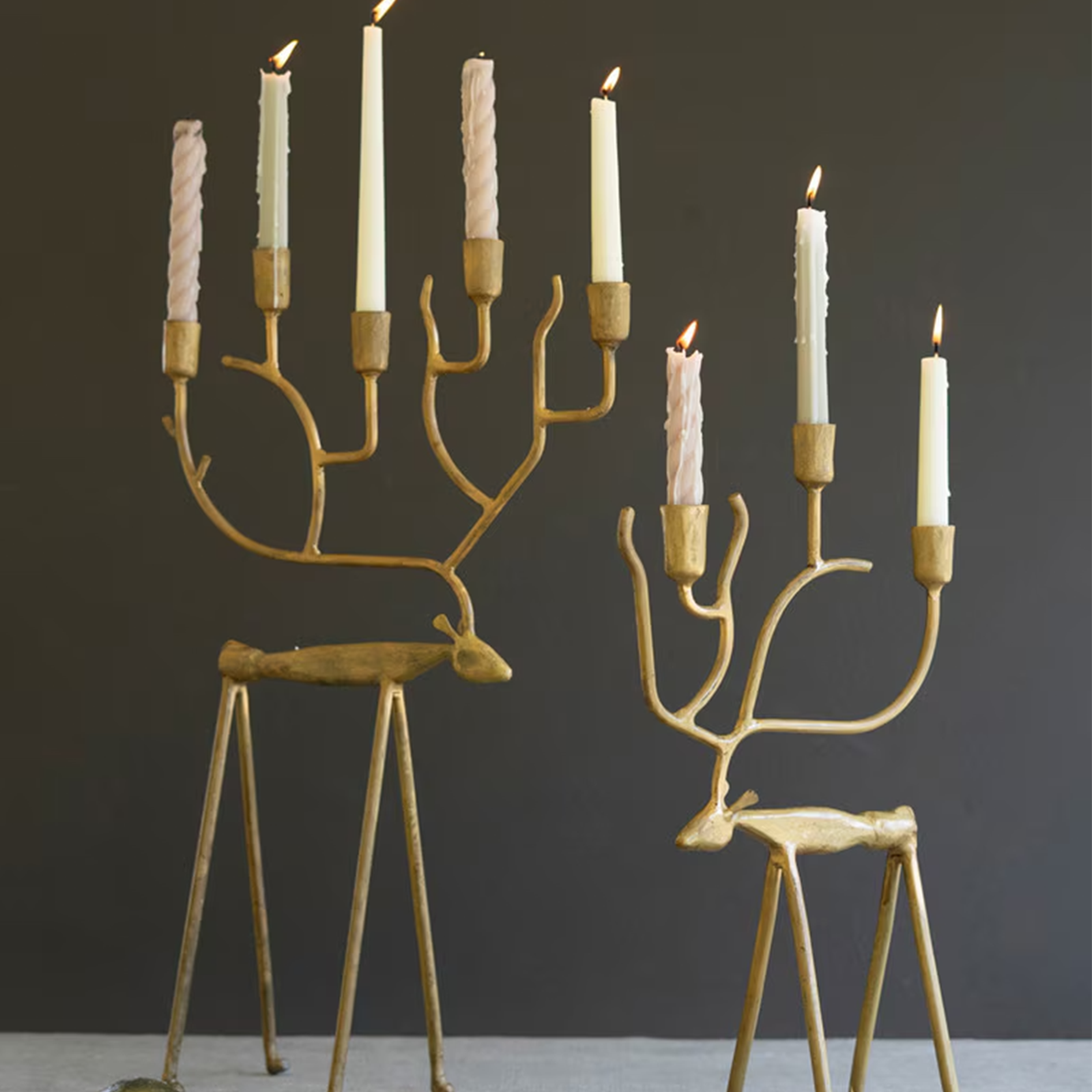 This set of two forged Christmas deer are taper candelabras. They have an antique gold finish which makes the perfect for a centerpiece or mantle decor.