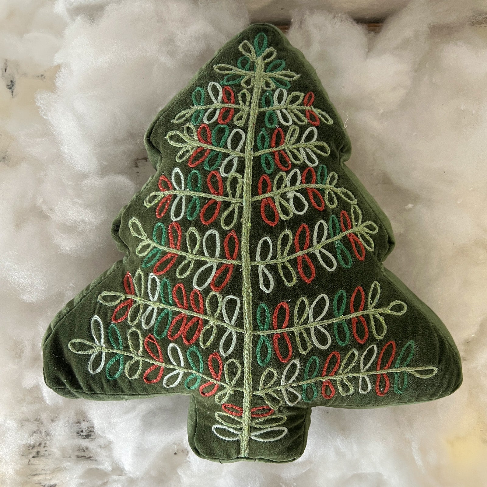 This woven cotton velvet tree-shaped pillow features detailed embroidery, adding a cozy and festive accent to your holiday décor.