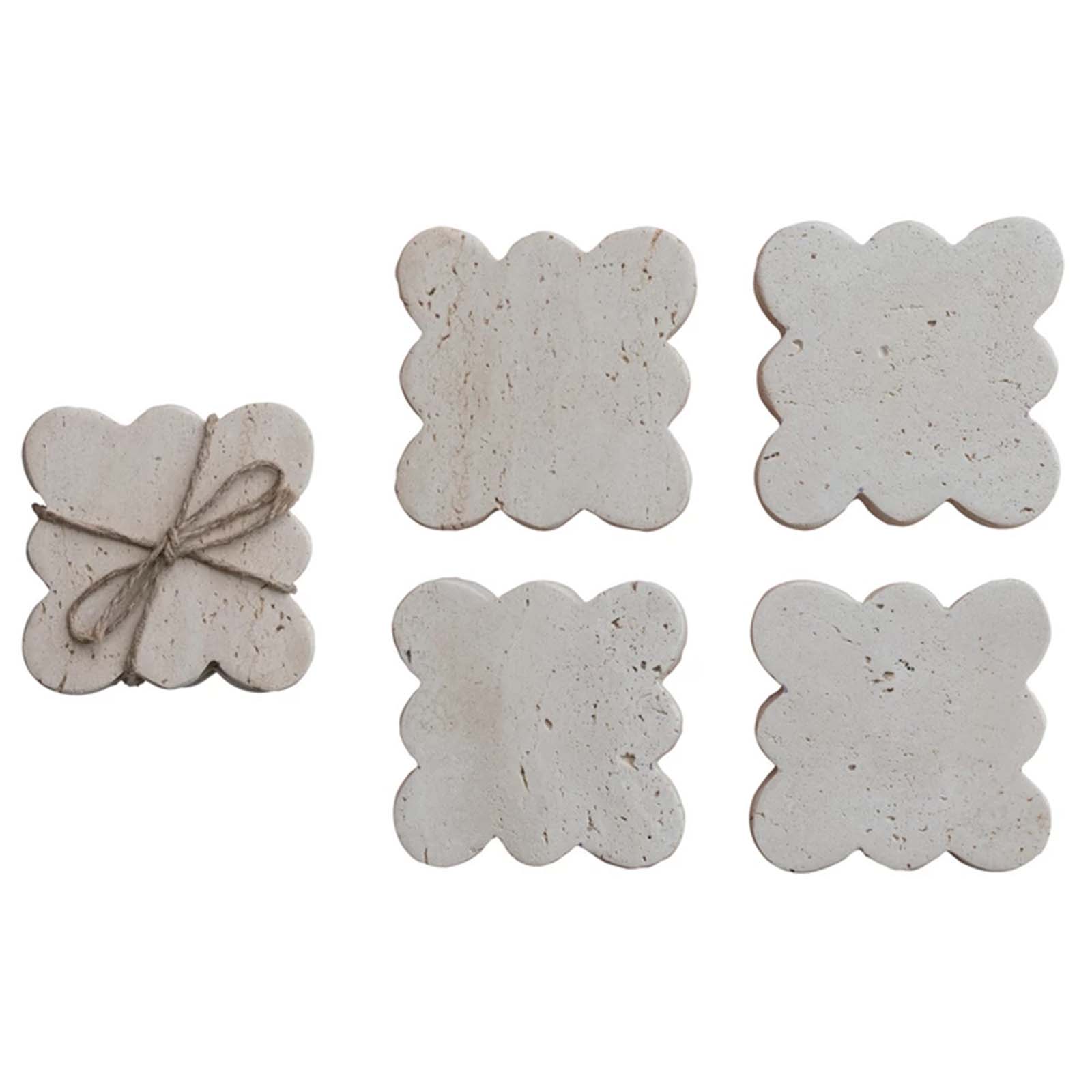 This set of 4 Square Travertine Coasters with scalloped edges is a perfect blend of functionality and decorative flair. The natural stone's texture and color variations make each coaster unique, while the scalloped edges add an artistic touch.