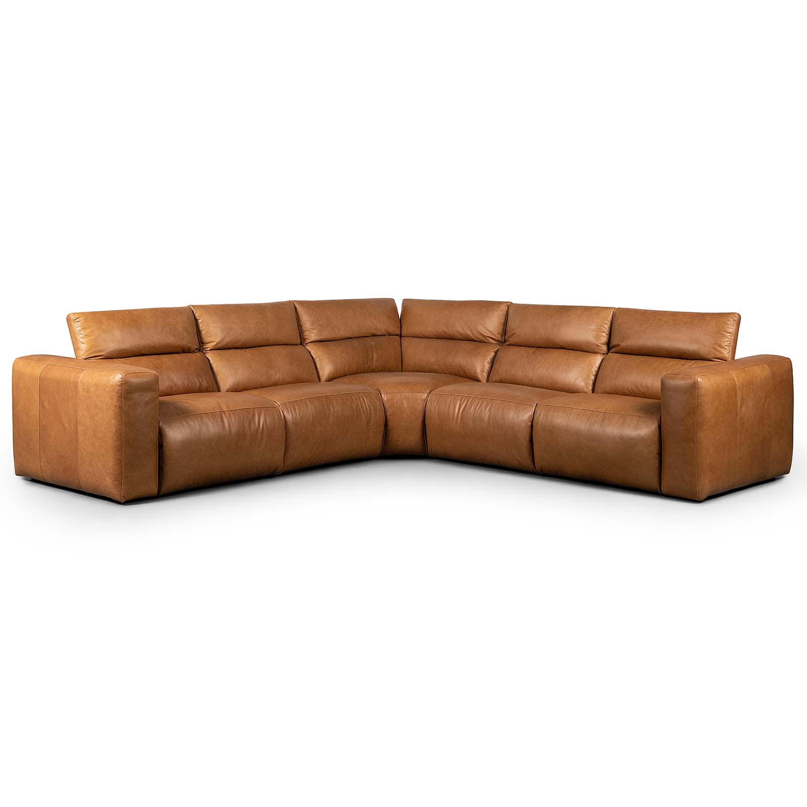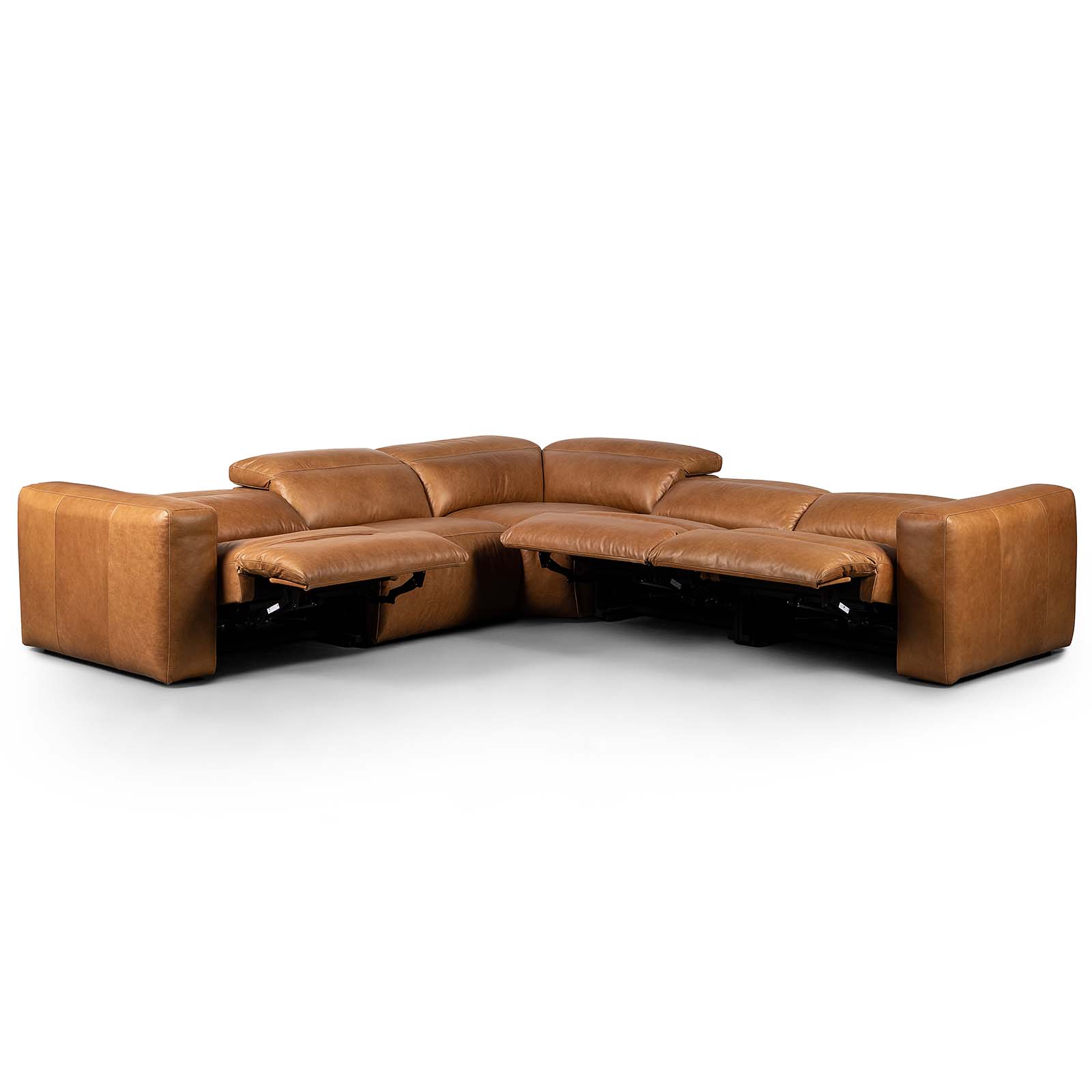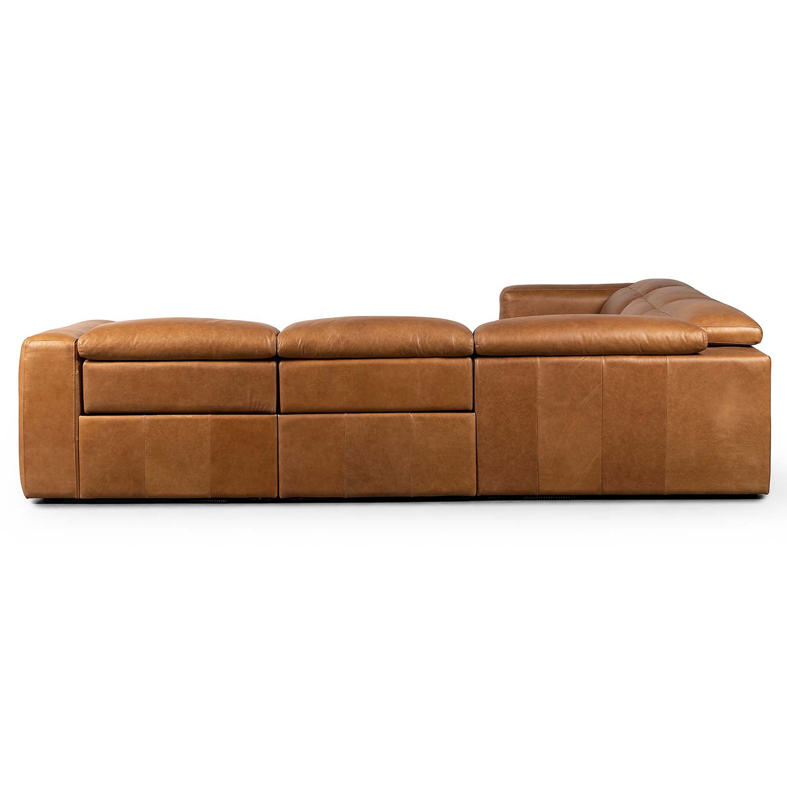 Soft, chic and comfort driven. Upholstered in butterscotch top-grain leather, subtle distressing adds character to this modular sectional, featuring a modernized electric recline for custom relaxation. Easily control footrest and headrest with a conveniently located side button. Includes 9'5" power cord.