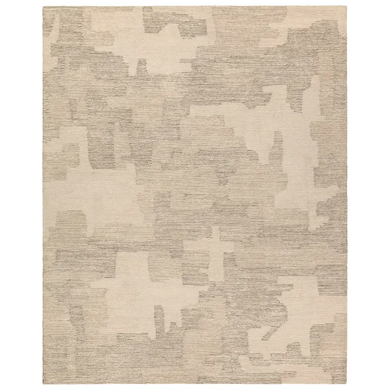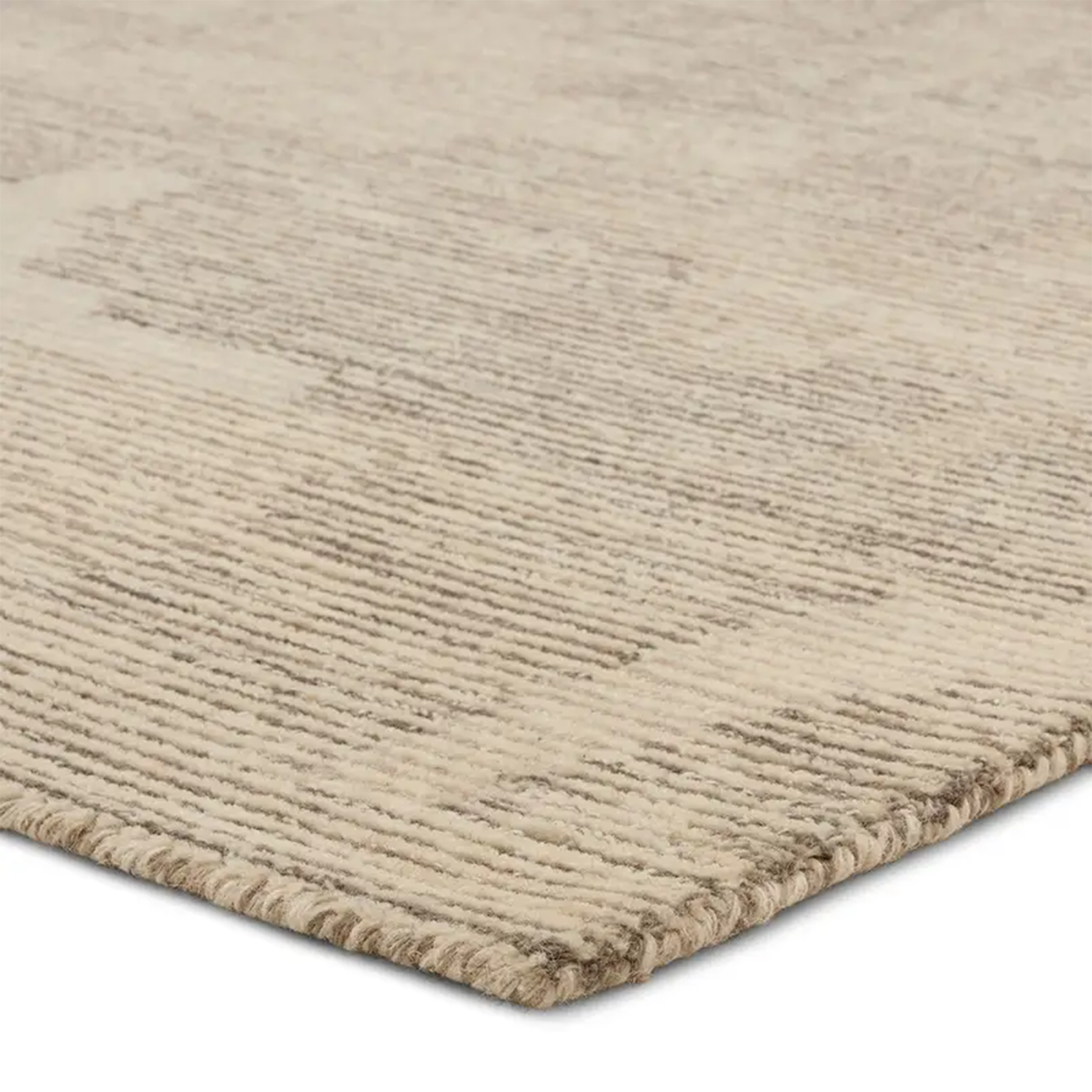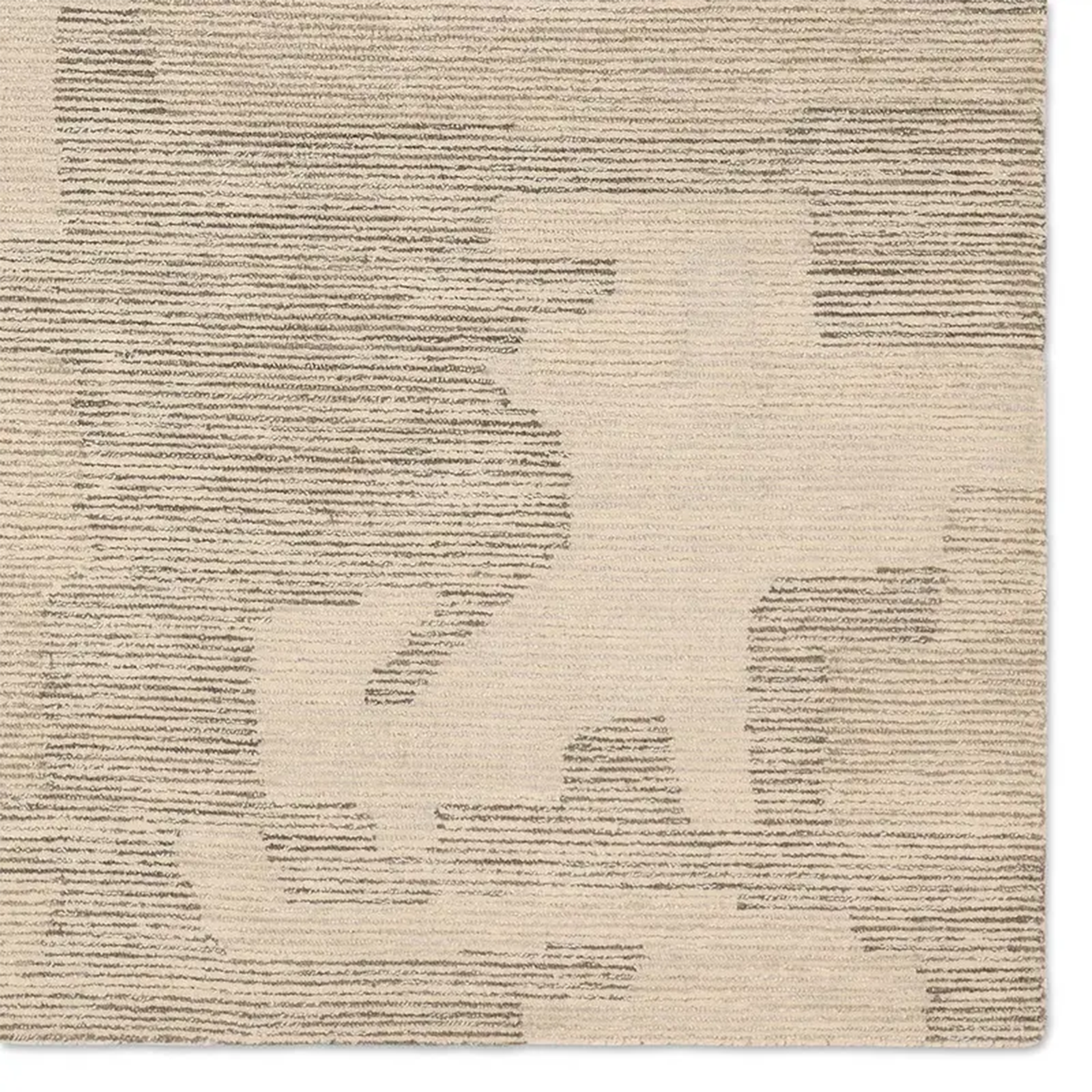 The design of this rug showcases a bold, geometric pattern with a modern brutalist influence in shades of gray and taupe, effortlessly adding depth and sophistication.