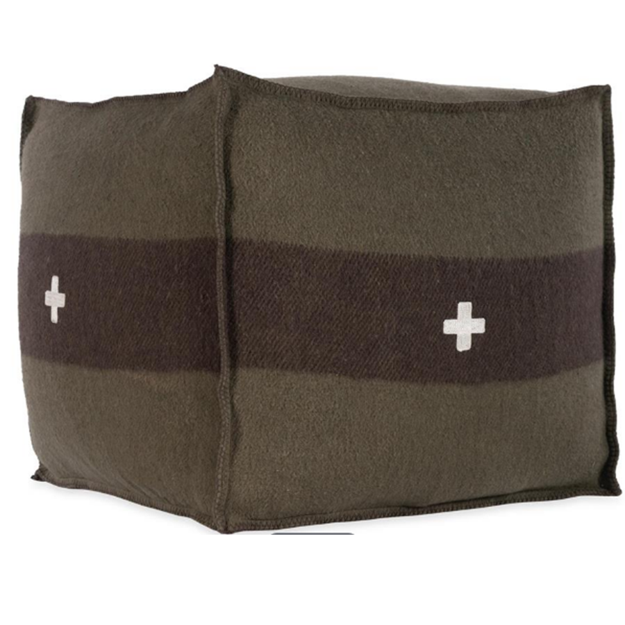 A cozy 24" x 24" pouf in earthy green and brown tones, blending natural warmth with versatile function as extra seating or a relaxed footrest.