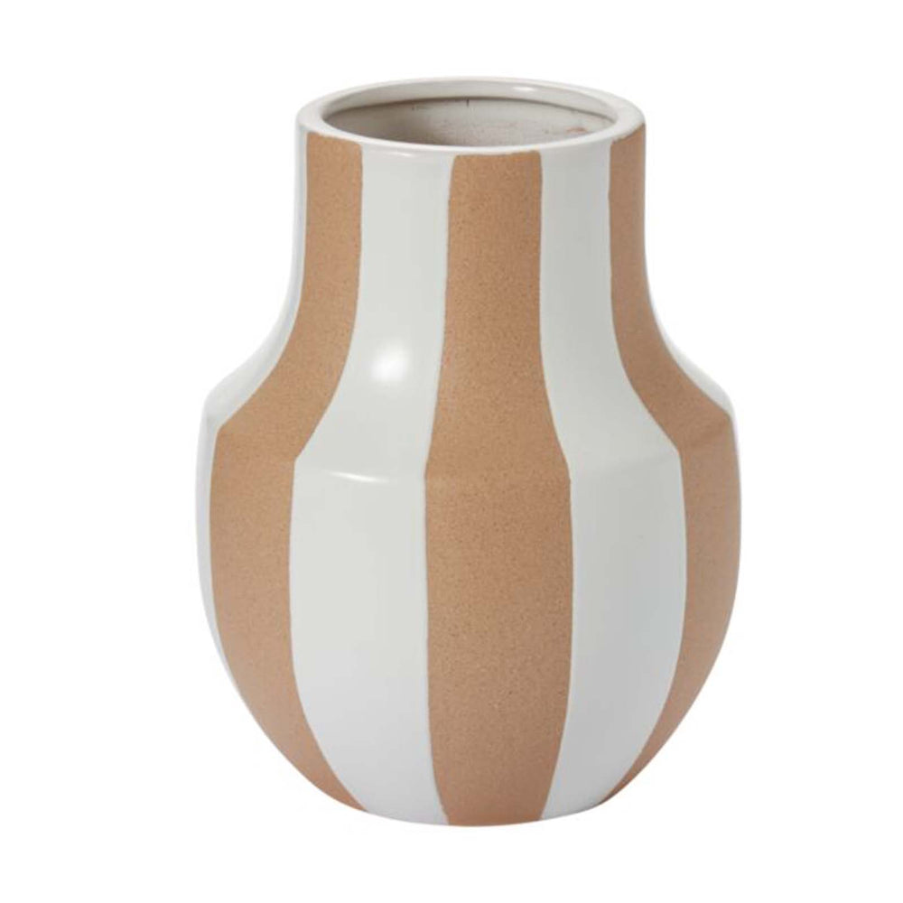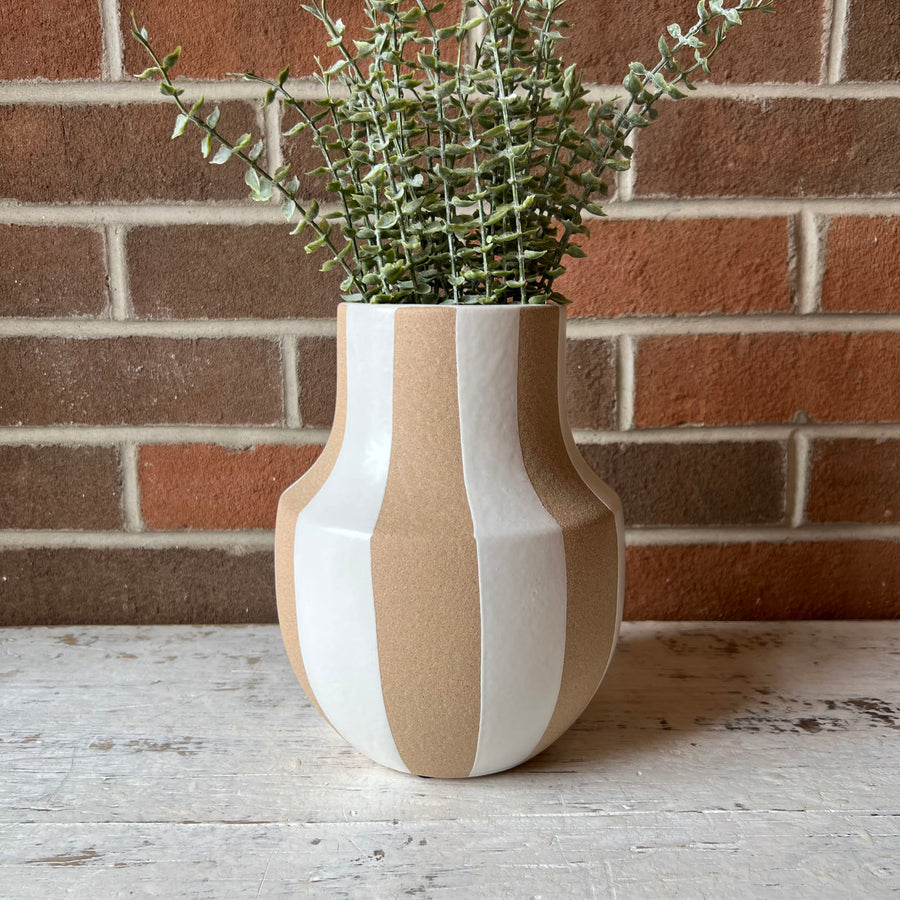 A modern take on classic design, the ceramic Bonita Vase features alternating smooth white glazed stripes painted onto textural, natural ceramic.