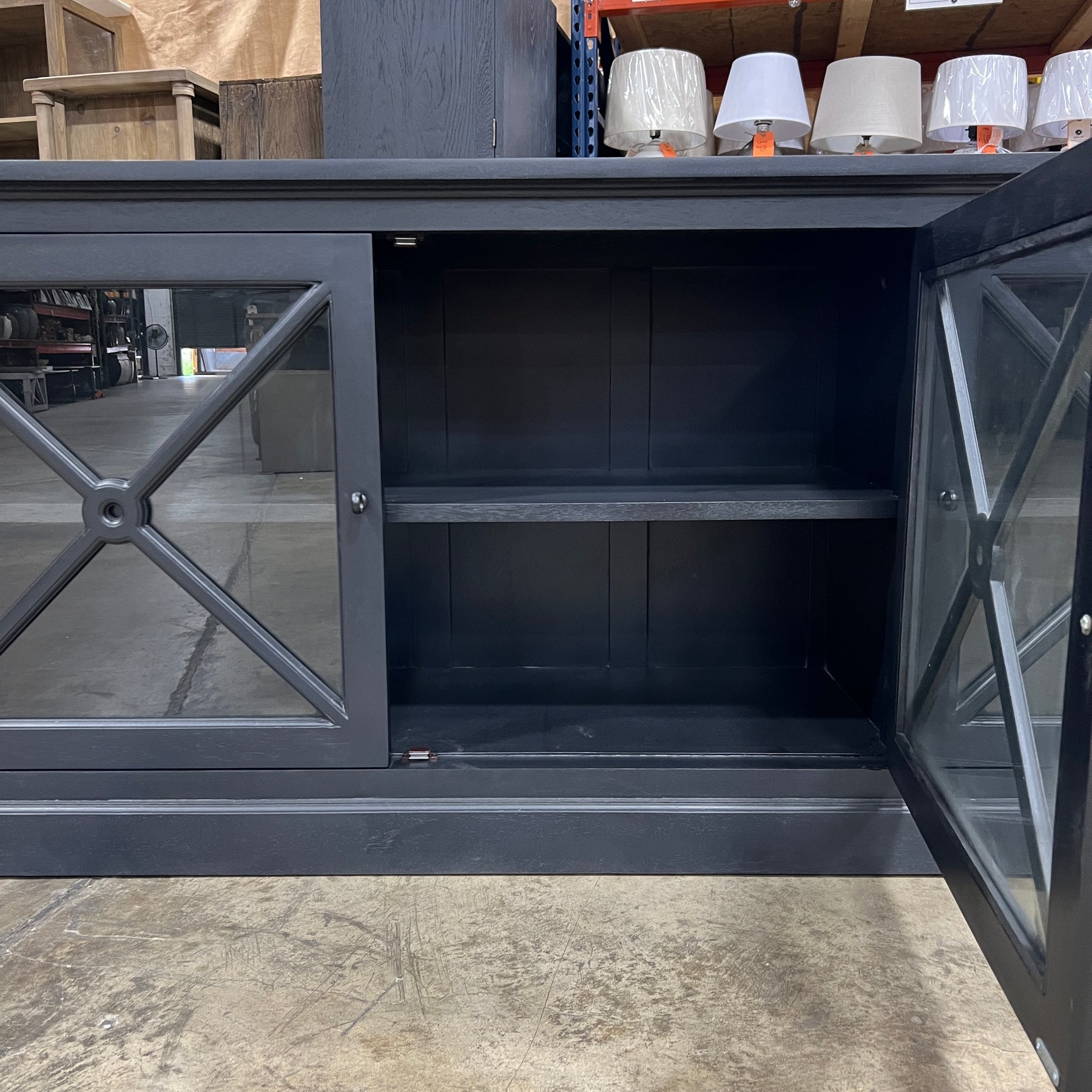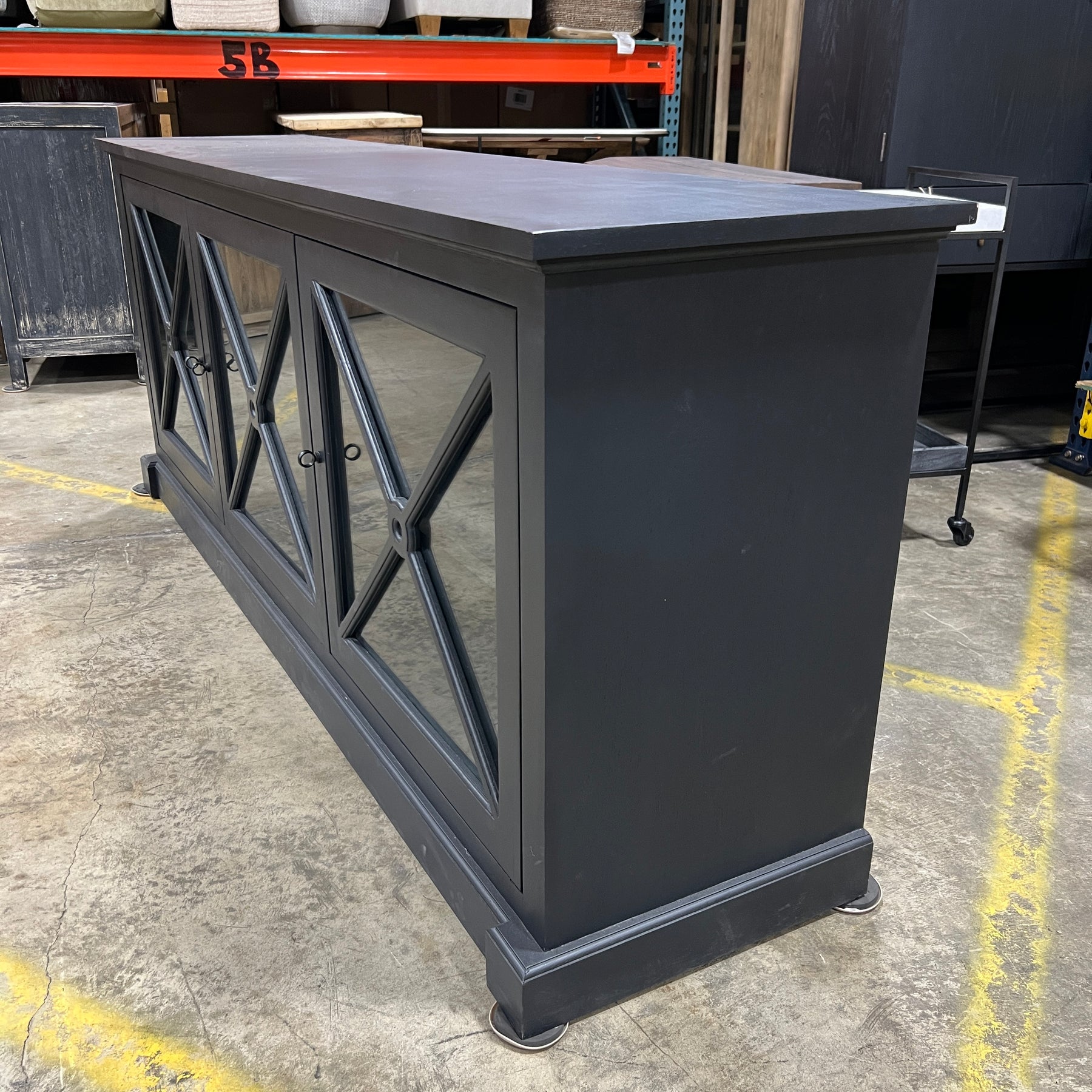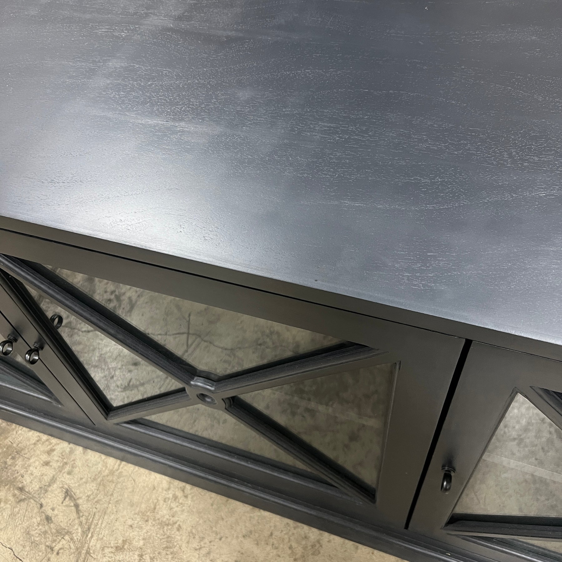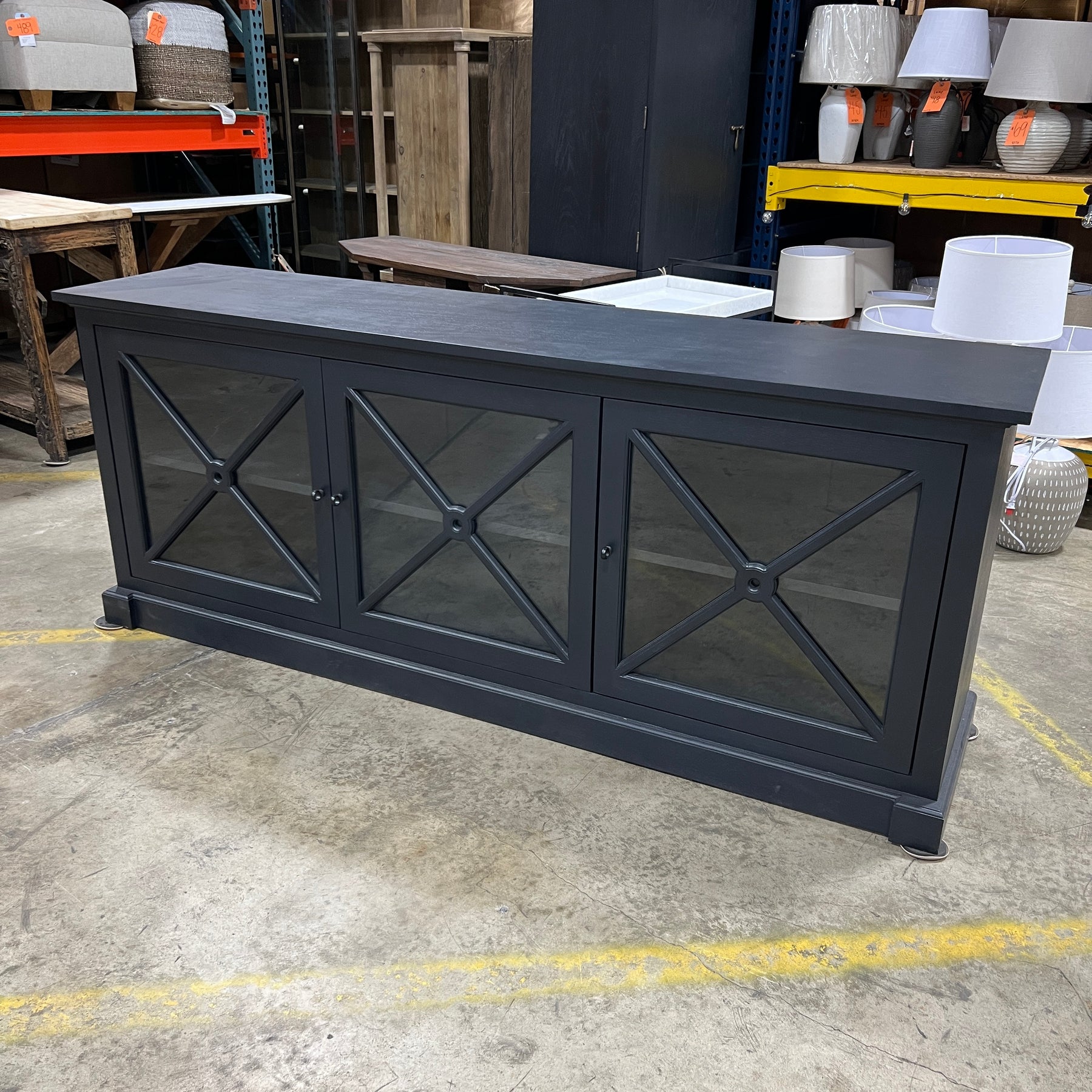 The Campbell 3-Door Sideboard in black features a striking X-detail design and spacious storage, blending modern elegance with practical functionality.