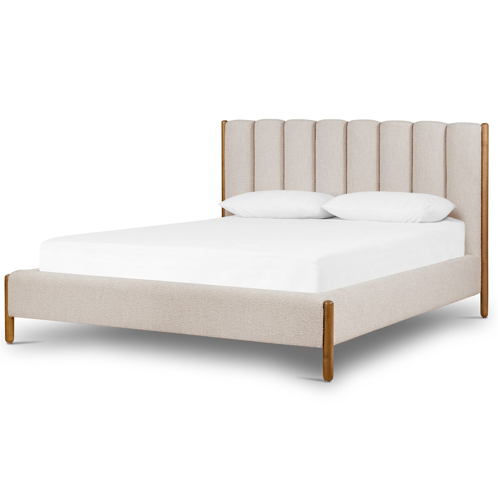 Upholstered with boucle-like fabric in a neutral sand, parawood legs run the height of a heavily channeled headboard, for a lengthy look with textural depth.