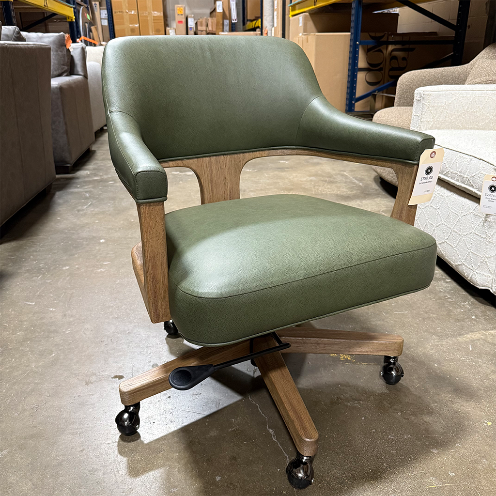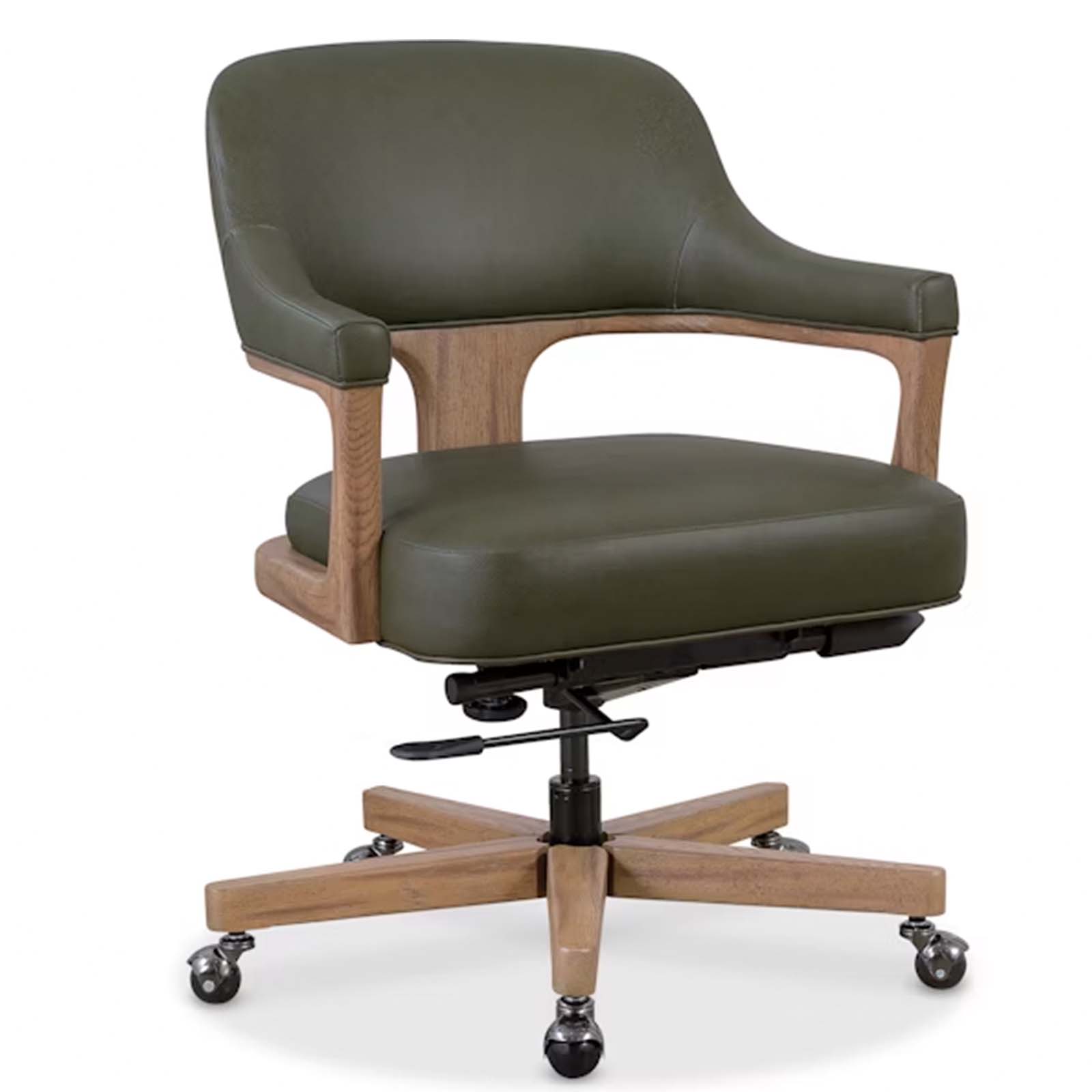 Wrapped in Verona Forest leather, this chair showcases a decorative wood frame with a light transparent finish. Perfect for transitional modern office spaces, it combines functionality with a tactile, luxurious feel.