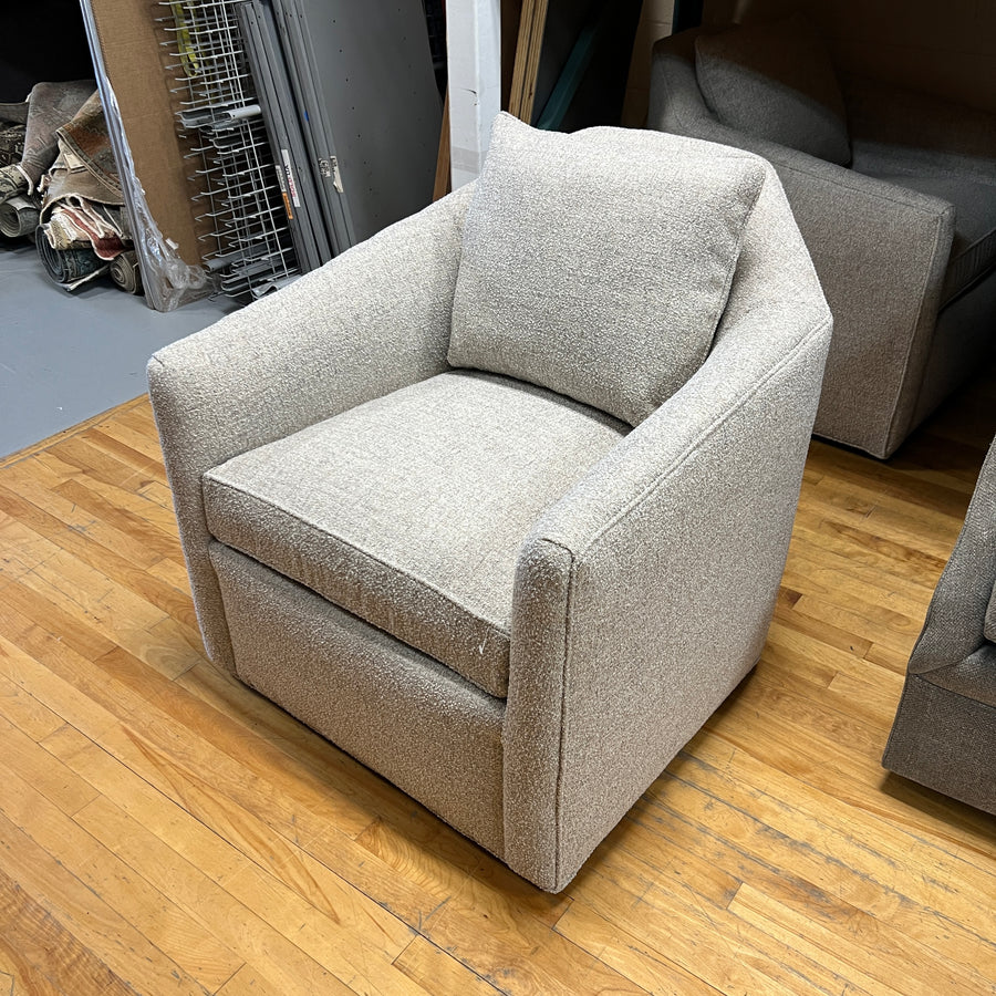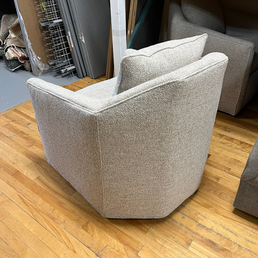 The Justine Swivel Chair pairs modern curves with smooth motion, wrapped in soft upholstery for a chic and comfortable accent to any space.