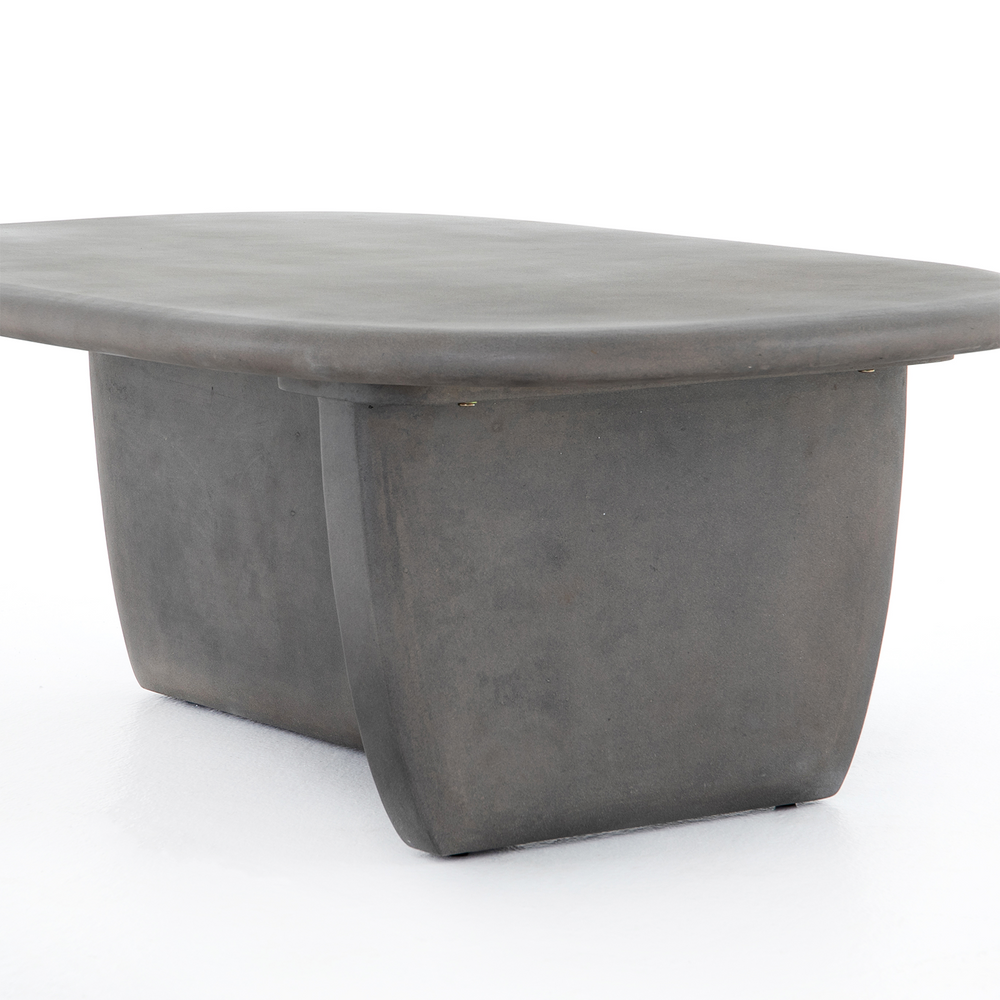 Modern and curve-driven. Dark Grey concrete forms a rounded rectangle top with bullnose edging, reminiscent of a shapely surfboard. Perpendicular bases bring eye-catching interest to outdoor lounging. Cover or store inside during inclement weather.