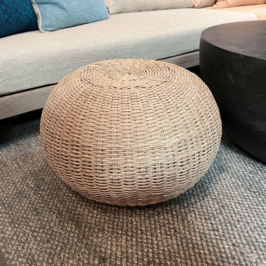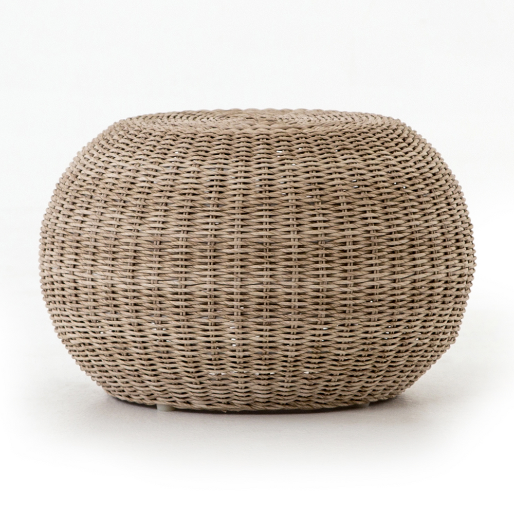 Natural in texture and tone. All-weather wicker weaves to cover an aluminum frame for a found feel with striking novelty. Soft round shape and vintage white finish lend a casual look with versatile appeal. Perfectly sized to bring an organic accent and handy extra surface to any space—indoors or out. Cover or store indoors during inclement weather!